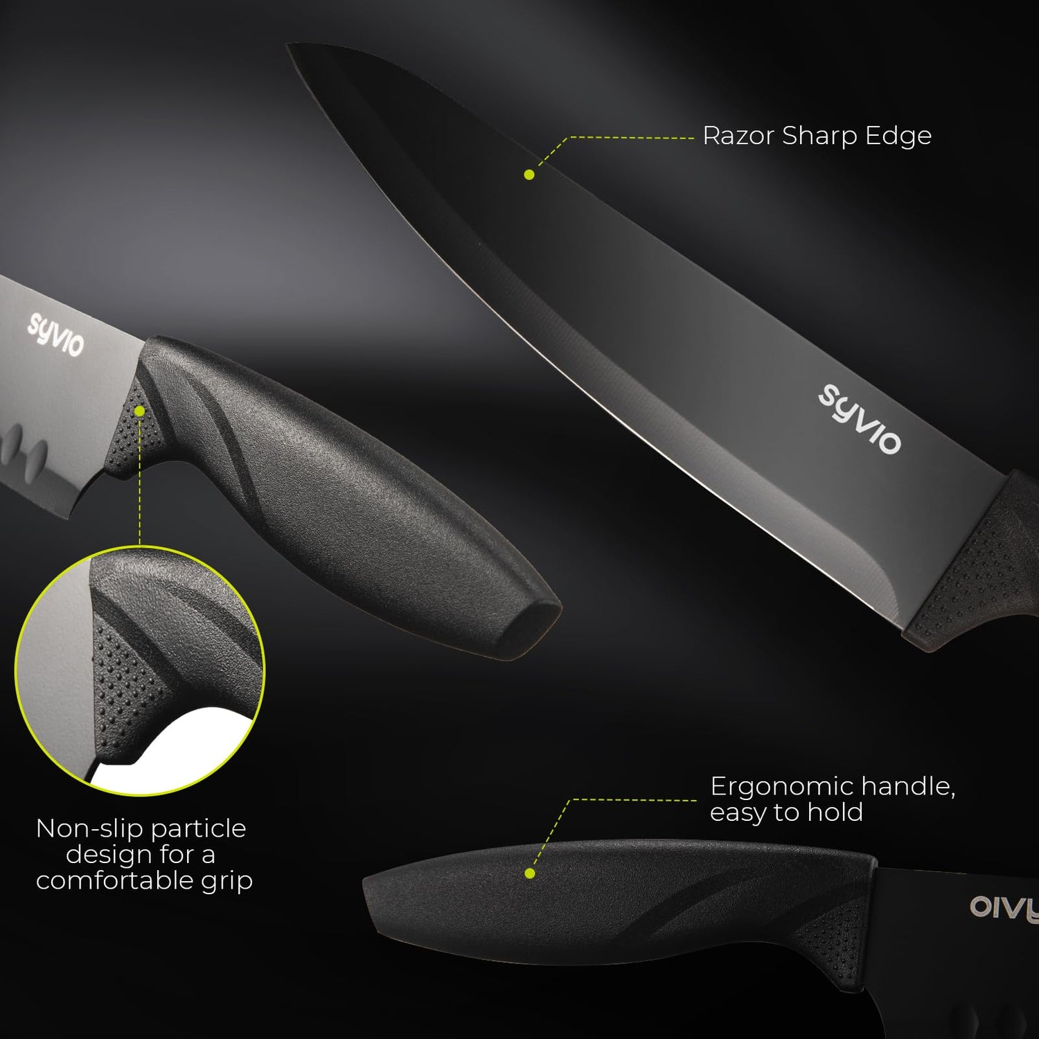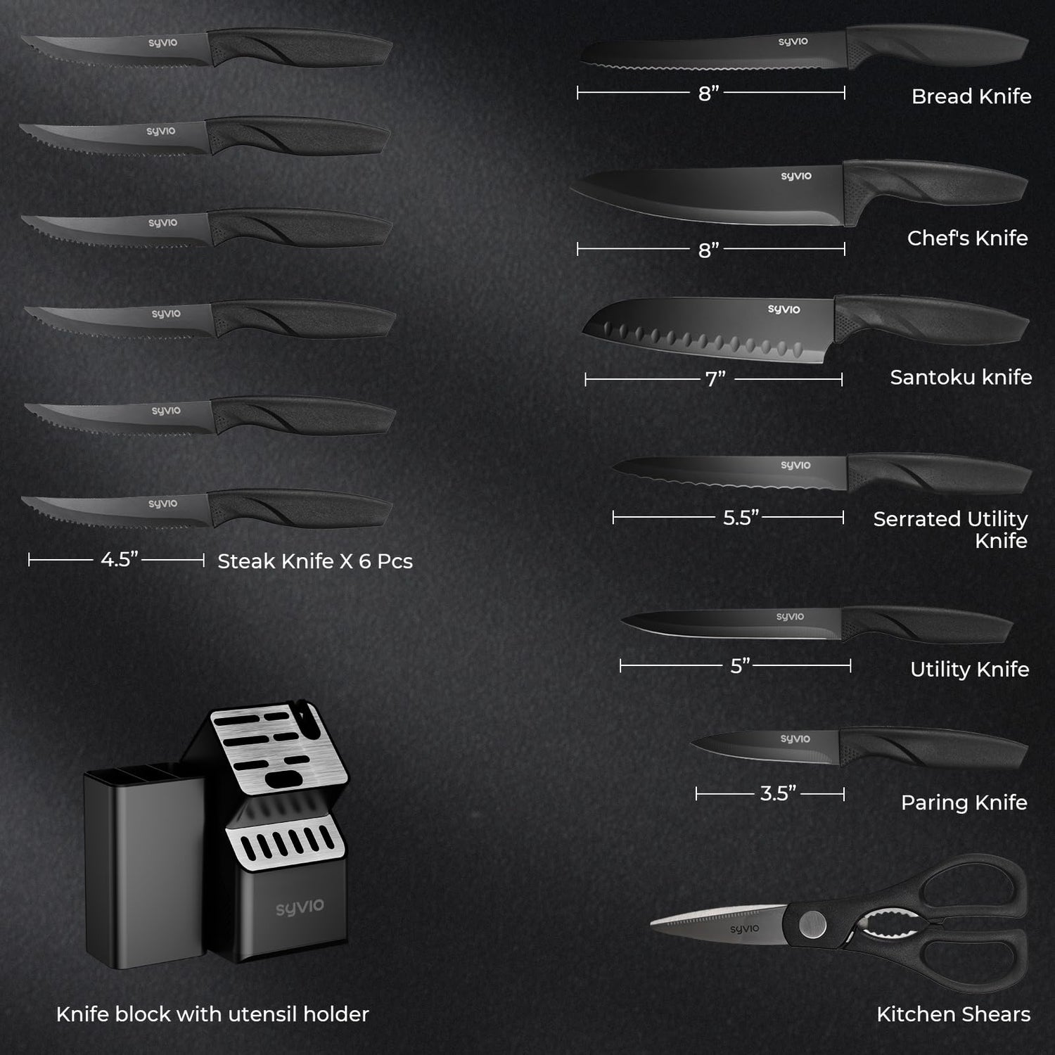 syvio Knife Set, 21pcs Utility Knife Sets for Kitchen with Block and Sharpener, Razor-Sharp, Effortless Sharpening, Premium Kitchen Knives with 6 pcs Kitchen Utensils Set and Utensil Holder, Black
