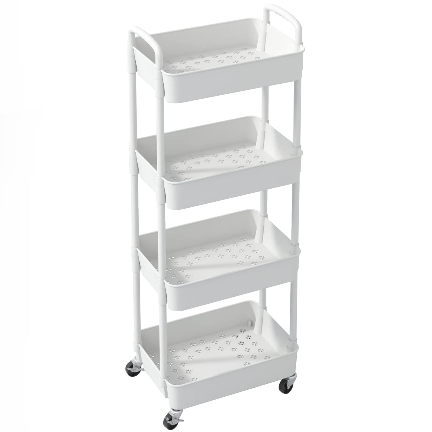 Sywhitta 4-Tier Plastic Rolling Utility Cart with Handle, Multi-Functional Storage Trolley for Office, Living Room, Kitchen, Movable Storage Organizer with Wheels, White