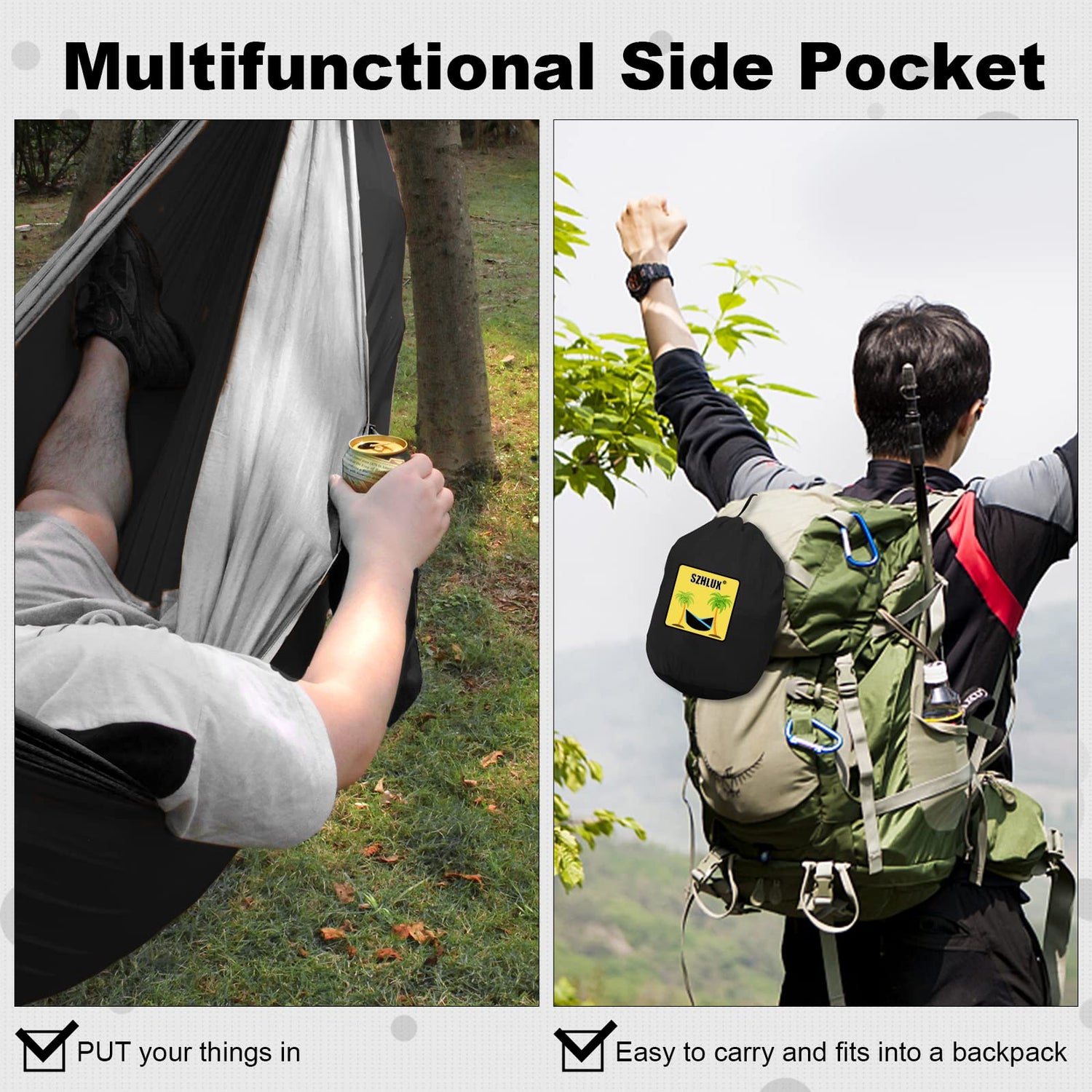 - Perfect hiking gear-Easy To Carry:This hiking hammock is easily packed in the attached stuff sack with bundled size 8.6*6.7*4inches and weight 2.38lbs only. You can hang it on your backpack and bring it to everywhere you want,which make it to be perfect hiking gear for outdoor travel.