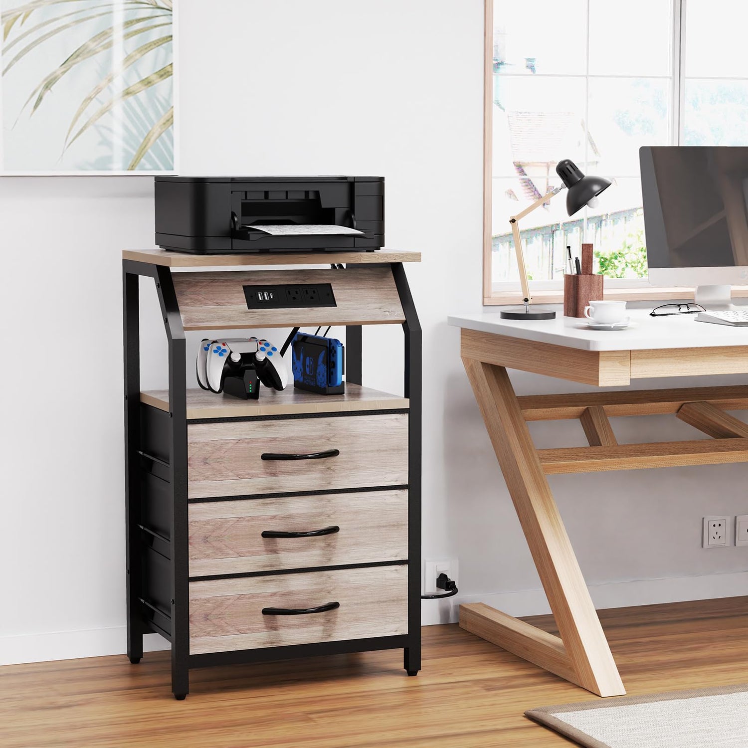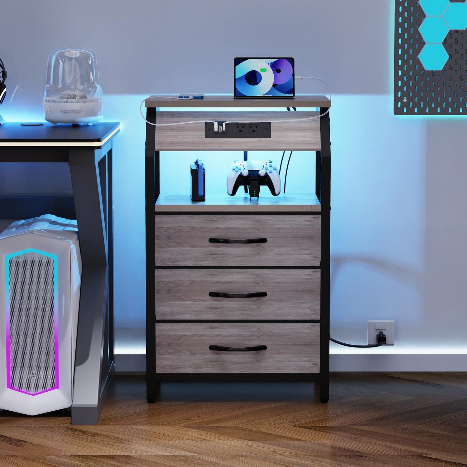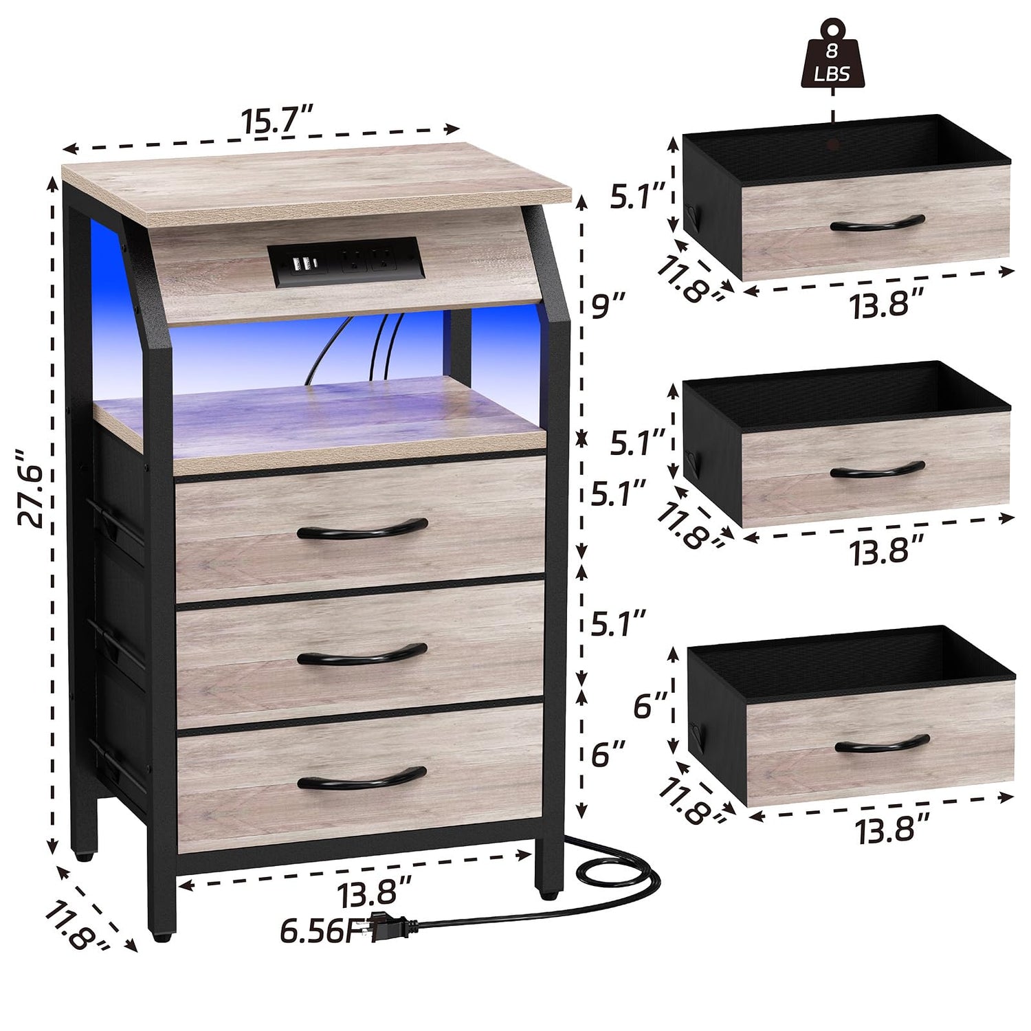 SZLHANJZ End Table with 3 Drawers, Night Stand with Charger Station and LED Lights, Small Nightstand with Fabric Storage, Farmhouse Side Table for Bedside, Living Room, Dorm, Greige