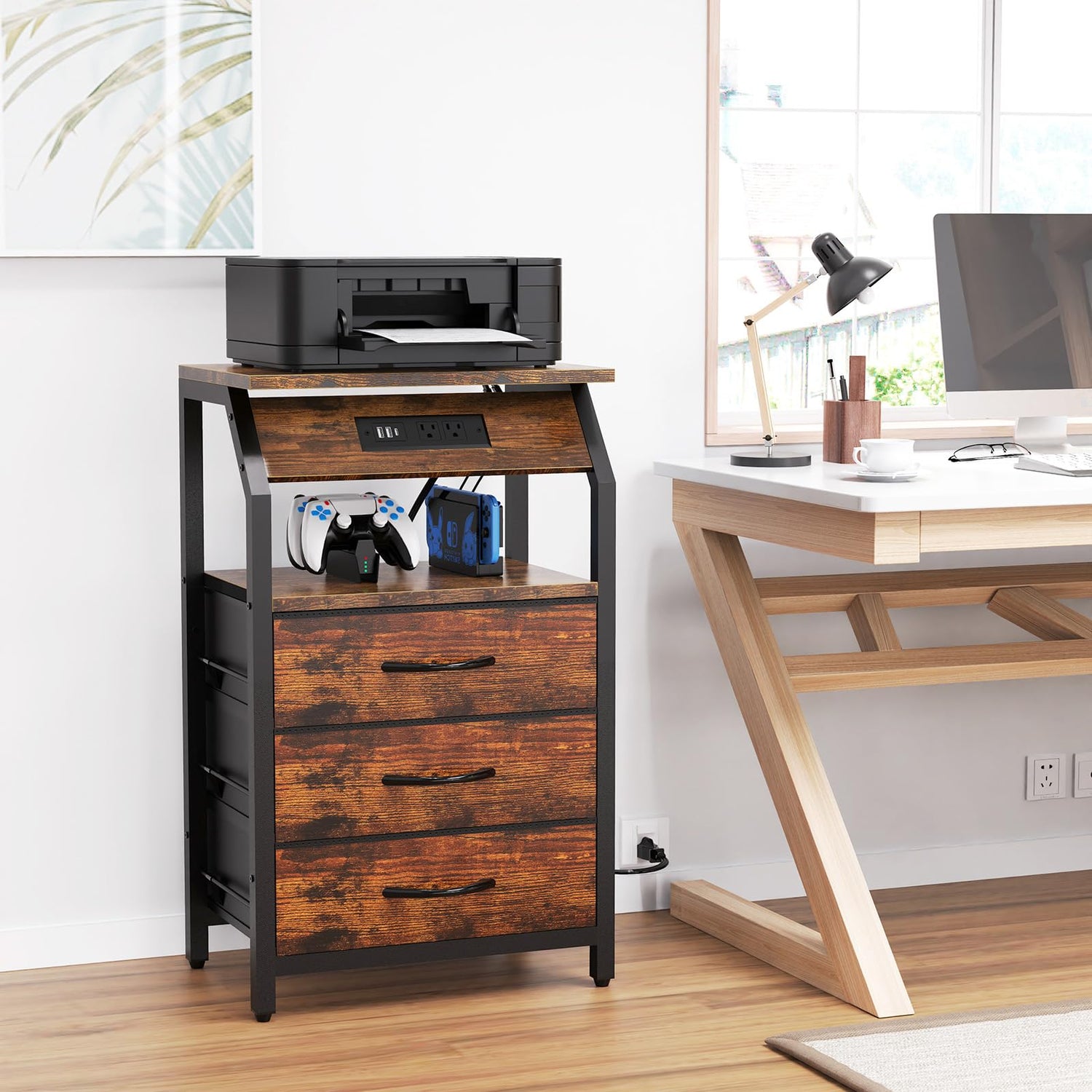 SZLHANJZ End Table with Charging Station, Nightstand with LED Lights and 3 Drawers, Small Dresser with Fabric Storage, Retro Side Table for Bedside, Living Room Dorm, Rustic Brown