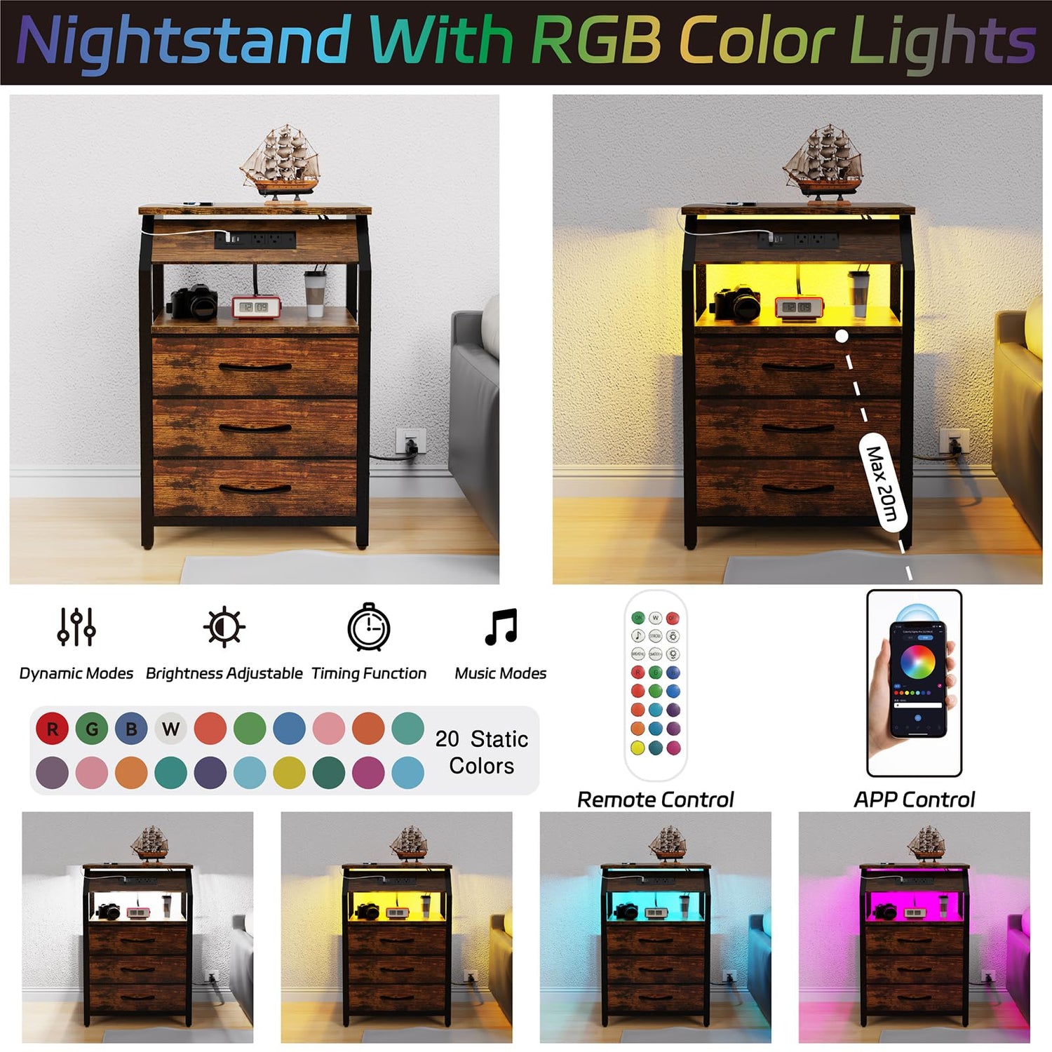 - Colorful LED Light: Add a pop of color to your room with our RGB LED light strip, offering 20 static colors, 20+ dynamic modes, and a music mode for an immersive experience. Easily adjust brightness and color temperature using the phone APP. Create a mesmerizing light show while enjoying your favorite tunes with our LED end table