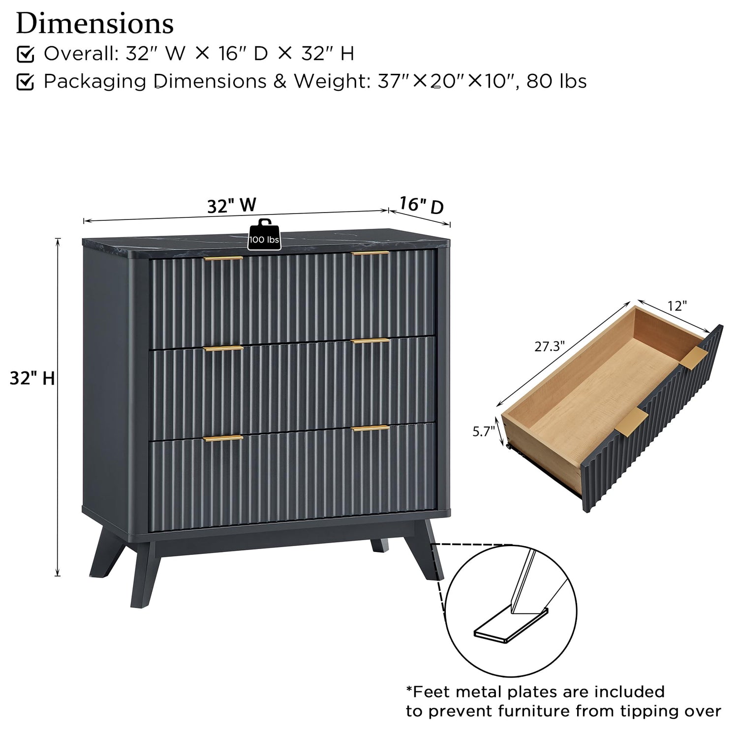 T4TREAM 32" Tall Fluted Nightstand, Modern Side Table with Faux Marble Top, 3 Drawers End Table w/Storage, Bedside Table for Bedroom, Living Room, Curved Profile Design, Dark Grey