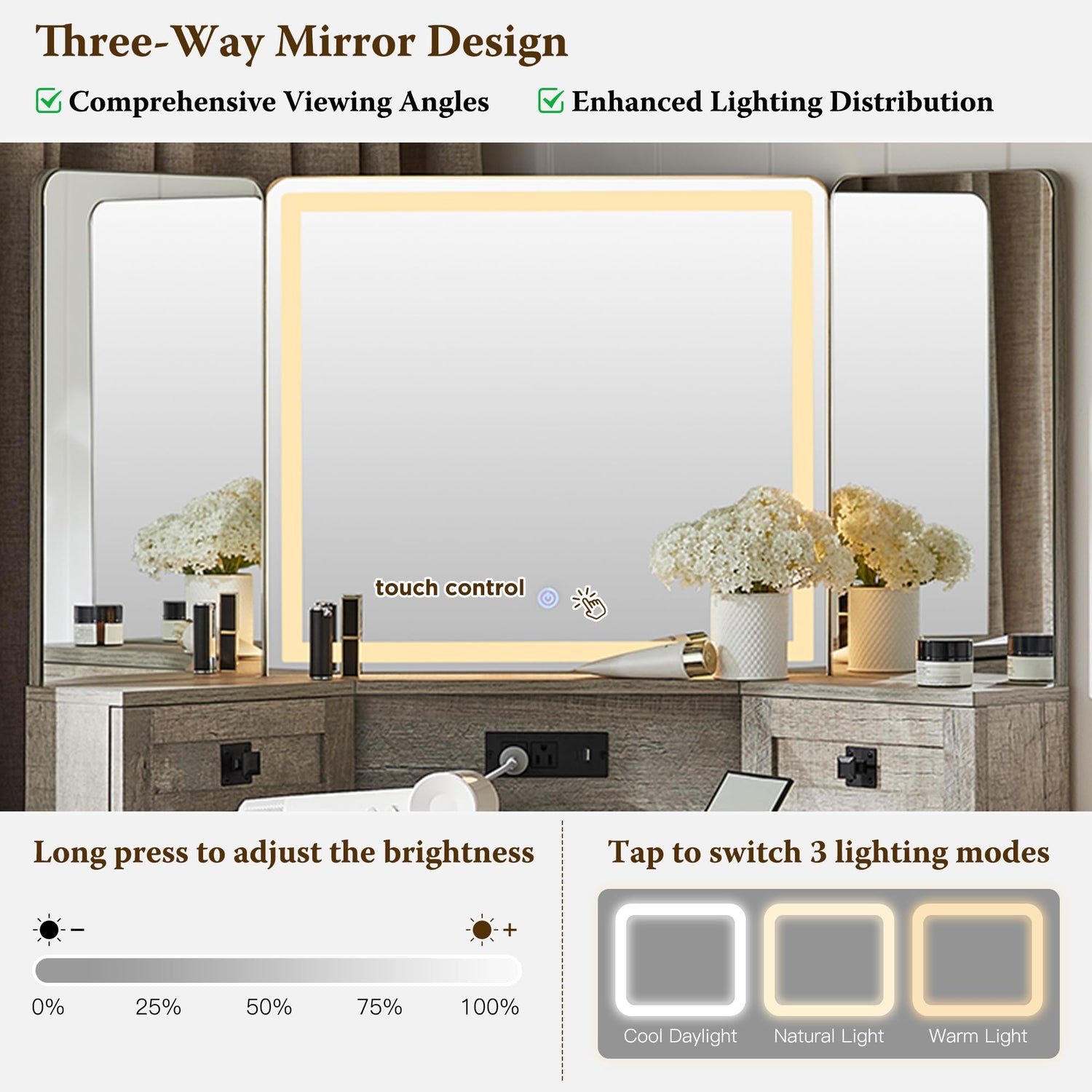 - Smart Illumination & All-Angle Visibility: Achieve flawless makeup & hairstyling with the 3-way mirror system (23" center + two 12" side mirrors) for 360° visibility. The touch-controlled LED lighting offers adjustable brightness & color temperature (warm/cool/natural) to match any lighting condition. Plus, 2 AC outlets + USB/Type-C ports keep your devices charged and ready.