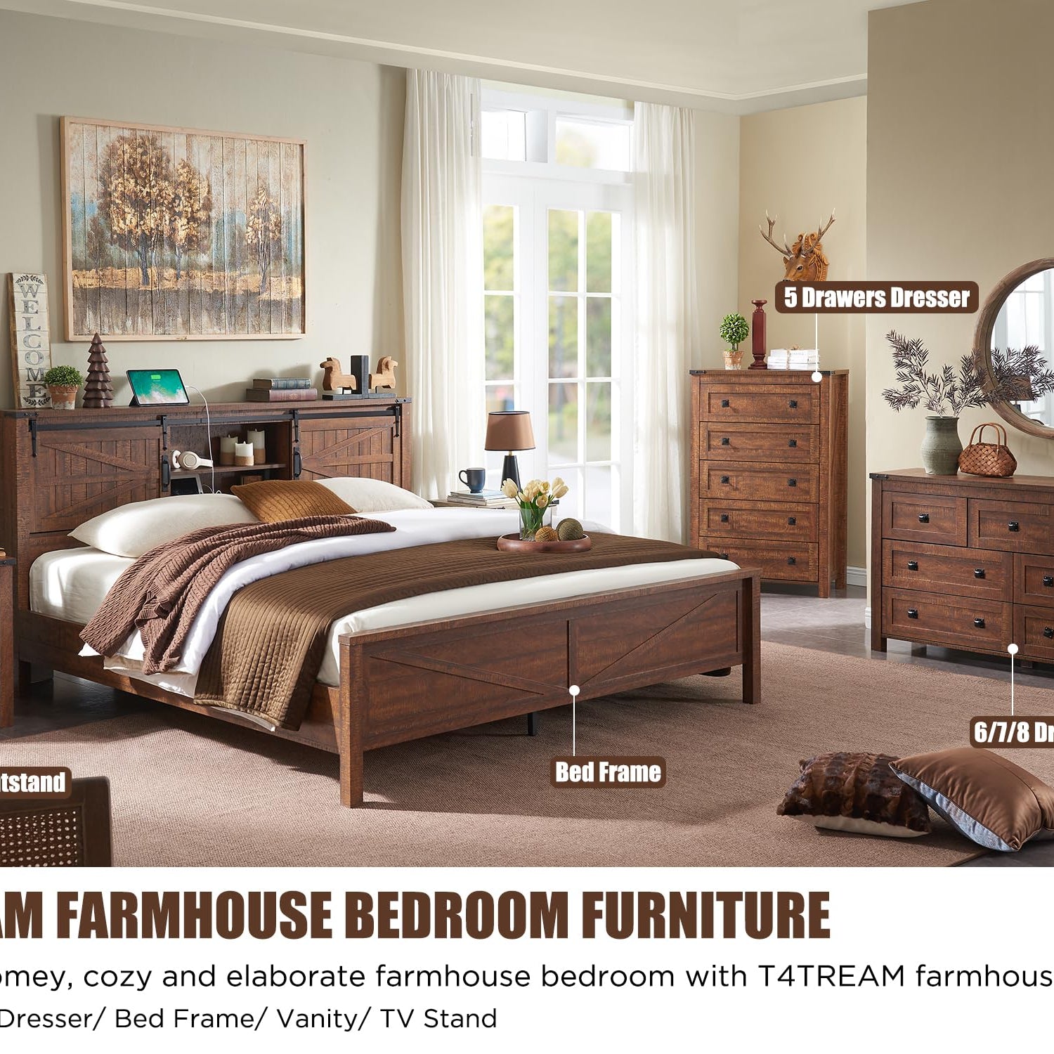 - 【Wooden Farmhouse 5 Drawers Dresser】Rustic wooden 5 drawer dresser with barn door style and spacious design is a perfect combination of modern and farmhouse style, adding character and charm to your bedroom and living room. Can be used for clothing organizer/lingerie dresser,entryway table, accent storage cabinet for living room.