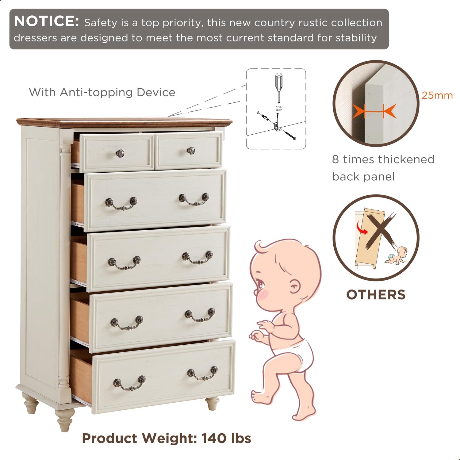 - DURABLE & STURDY: The bedroom dresser is made of durable solid wood and engineered wood for long-term use, scratch-resistant. No strong odor. It's made of premium P2 manufactured wood with a distressed neutral finish of your choice. Each drawer holds up to 25 lbs, and the thickened table surface can support up to 100 lbs