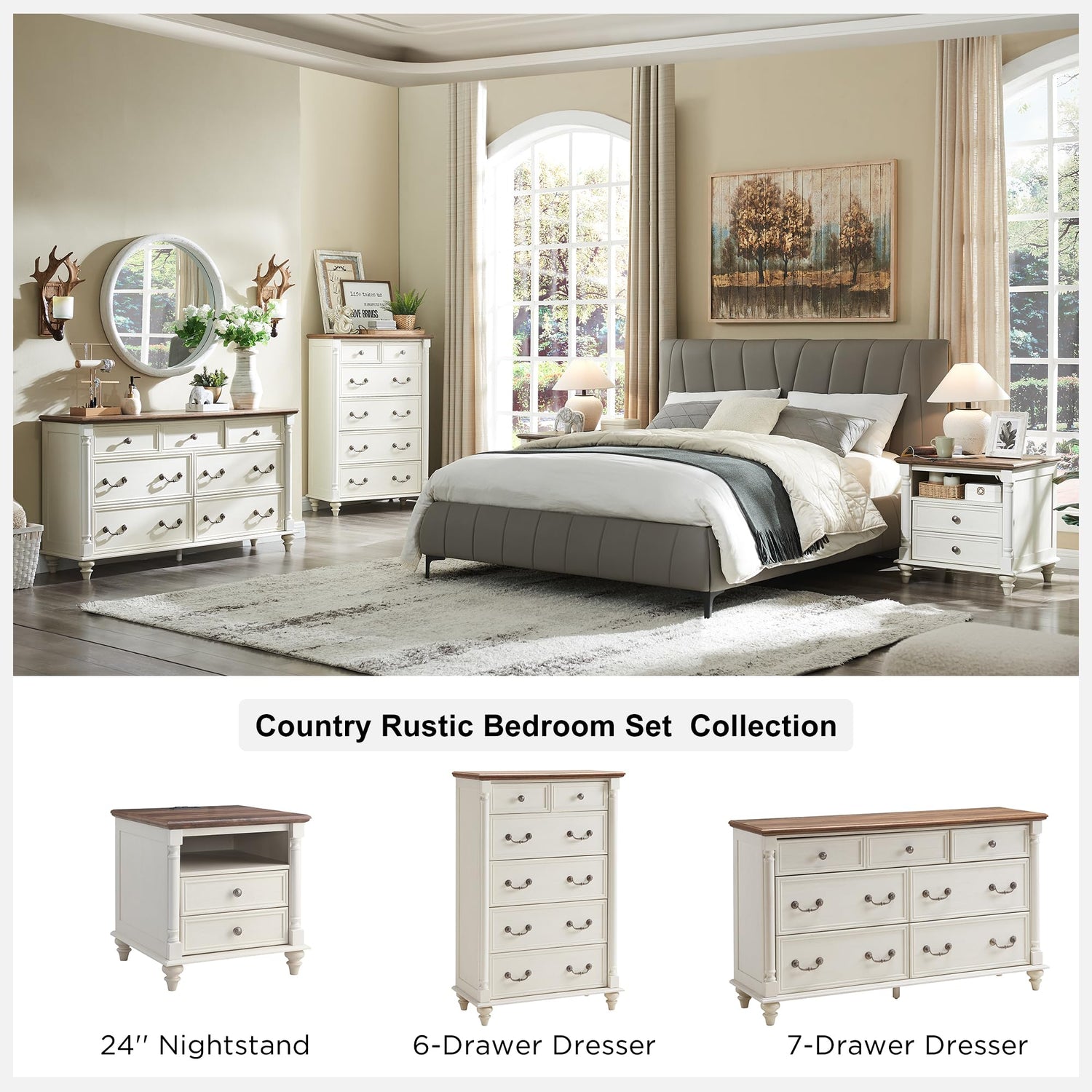 - EXQUISITELY CRAFTED: Measuring 54''W* 16'' D *31.2'' H. With an antiqued two-tone wood grain that stands out against the distressed finish, this transitional 7-drawer dresser brings a warm presence to your bedroom/living room. Beautified with 4 solid wood feet & and the solid wood column decor which is wonderfully easy on the eyes. Paired with the unique antique-tone pulls which is made for years of satisfaction. IT COMES WITH A WHOLE SET BEDROOM FURNITURE COLLECTION TO PAIR