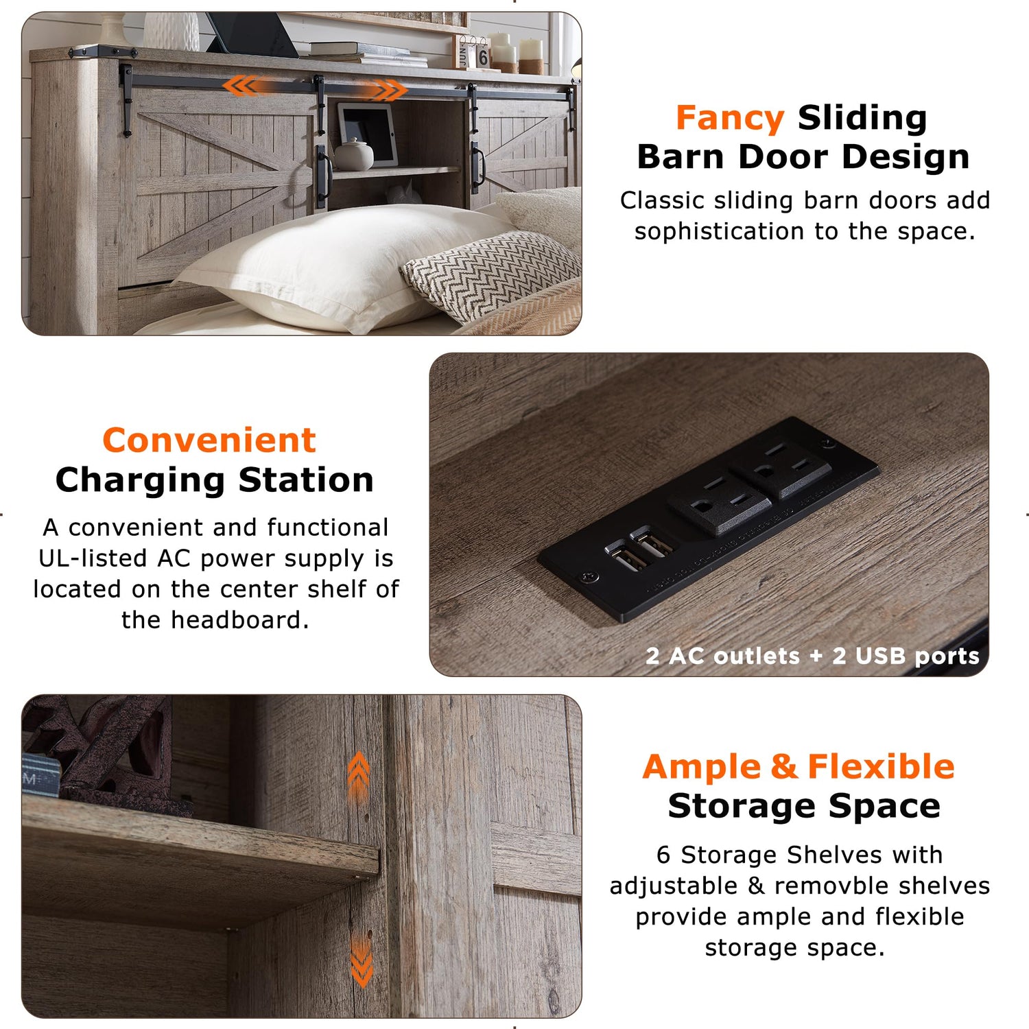 Designed with practicality in mind, this bed frame offers a spacious top panel and six adjustable shelves, providing ample storage and display space for your books, decor, and essentials—making everything easily accessible while you unwind in bed. The chic barn doors cleverly conceal any clutter, helping you maintain an organised and tranquil atmosphere.