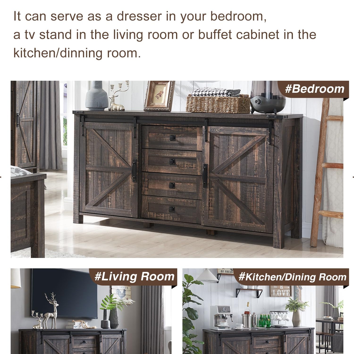 Farmhouse Rustic Sideboard Buffet Cabinet with Sliding Barn Doors and Drawers - 60" Dark Rustic Oak