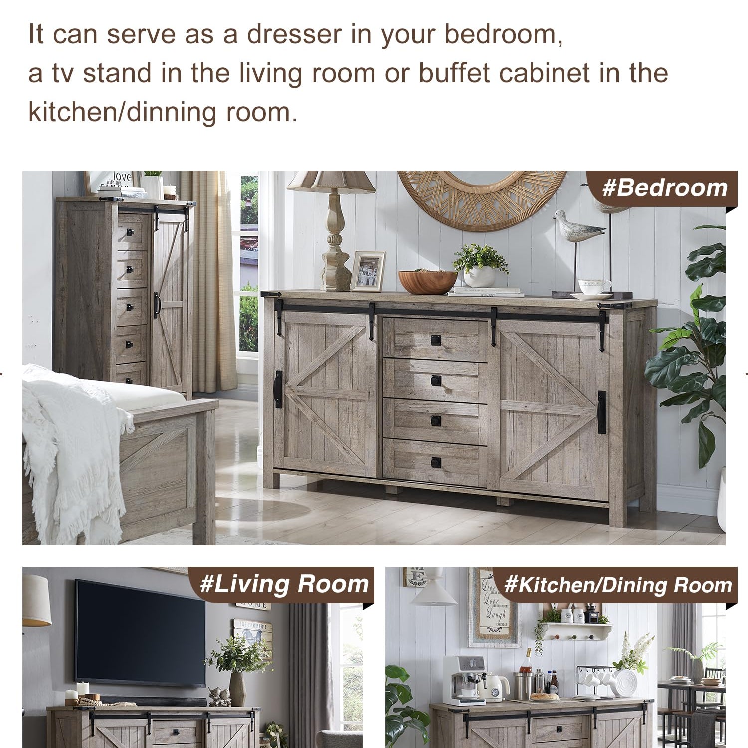 Rustic Oak Farmhouse Buffet Cabinet with Sliding Barn Doors and 4 Drawers - 60" Storage Solution