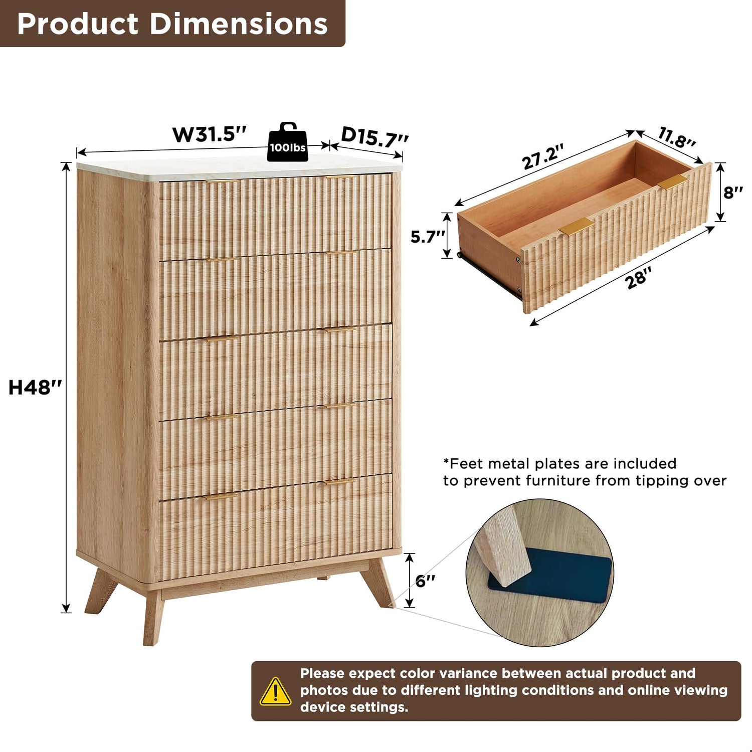 T4TREAM Fluted 5 Drawers Dresser, 48" Tall Modern Chest of Drawers with Faux Marble Top, Curved Profile Design, Wood Drawer Organizer for Bedroom, Living Room, Hallway, Entryway, Natural Oak