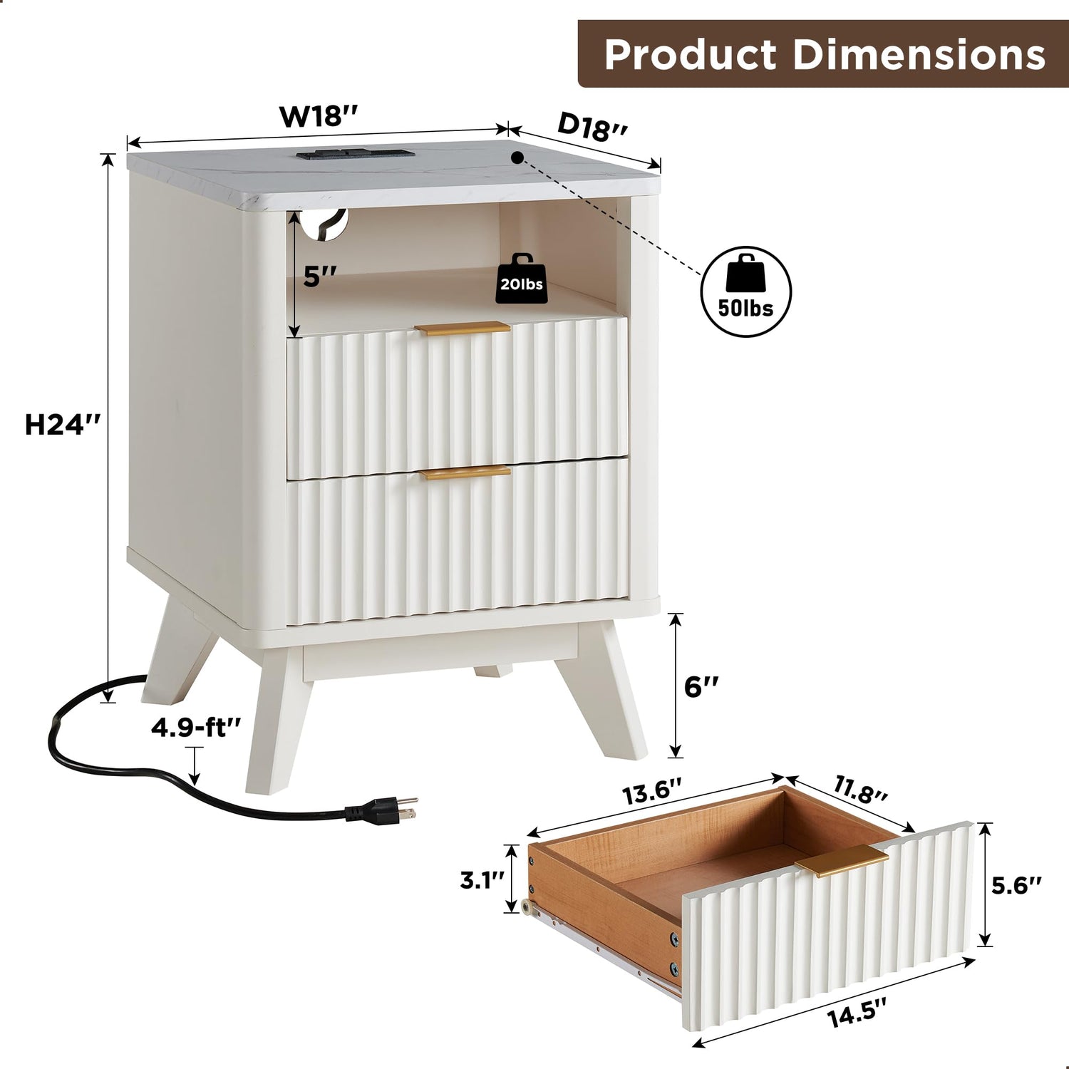 Details: T4TREAM Fluted Nightstand with Charging Station, 18" Modern Side Table with Faux Marble Top, 2 Drawers End Table w/Storage, Bedside Table for Bedroom, Living Room, Curved Profile Design, Solid White