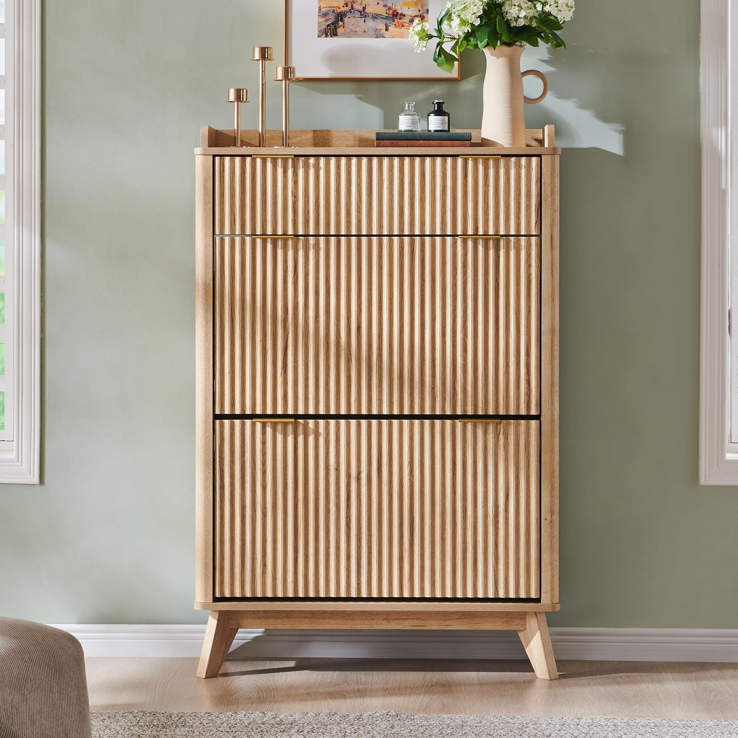 T4TREAM Fluted Shoe Storage Cabinet with 2 Flip Drawers & Top Drawer, 48" Tall Narrow Shoe Organizer, Curved Profile Design, Wooden Shoe Rack for Entryway, Living Room, Hallway - Natural Oak