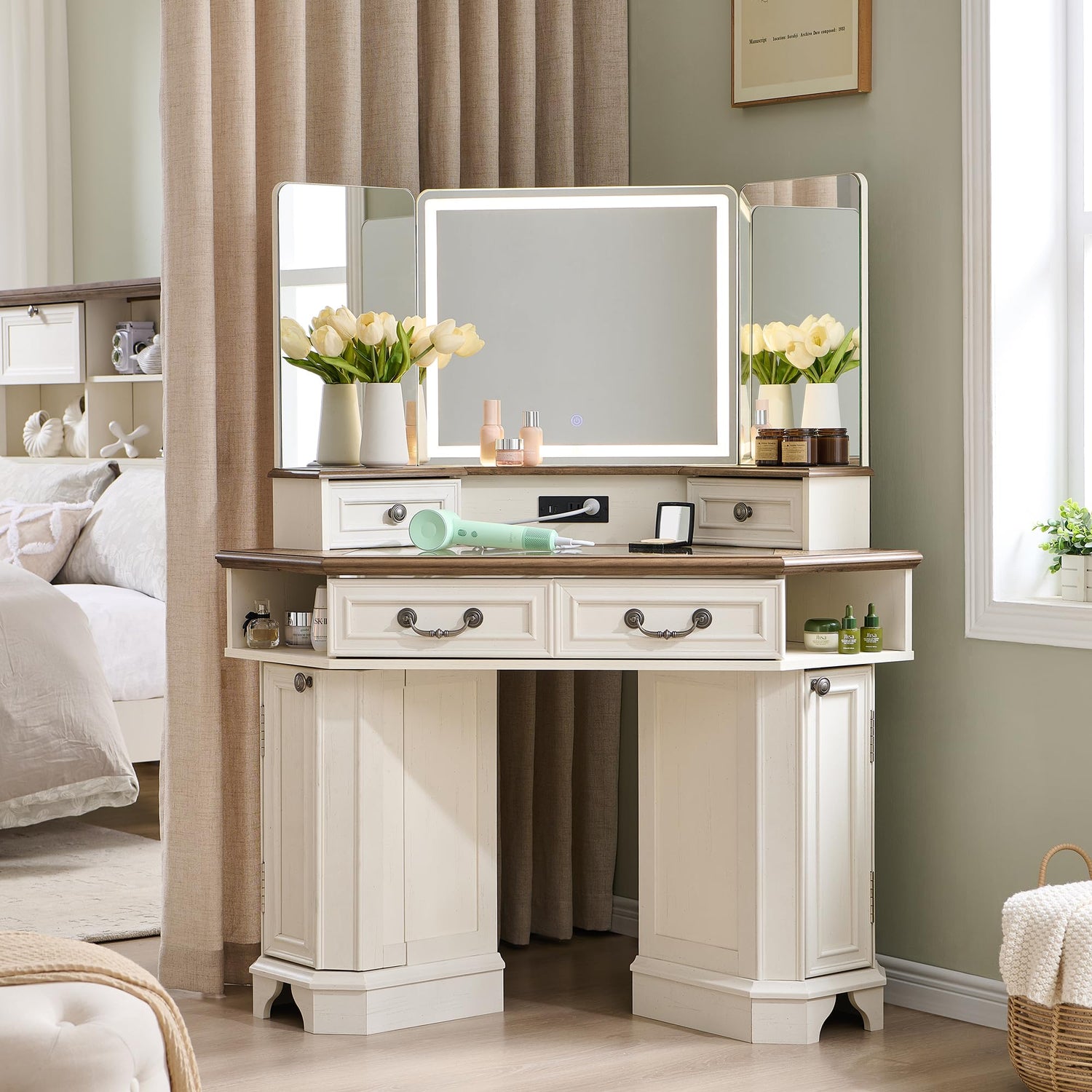 T4TREAM Makeup Vanity Desk 48" with 3 Way Mirror and Lights, Large Farmhouse Corner Vanity Dressing Table with Glass Top & Charging Station, 3 Drawers & 2 Storage Cabinets for Bedroom, Antique White
