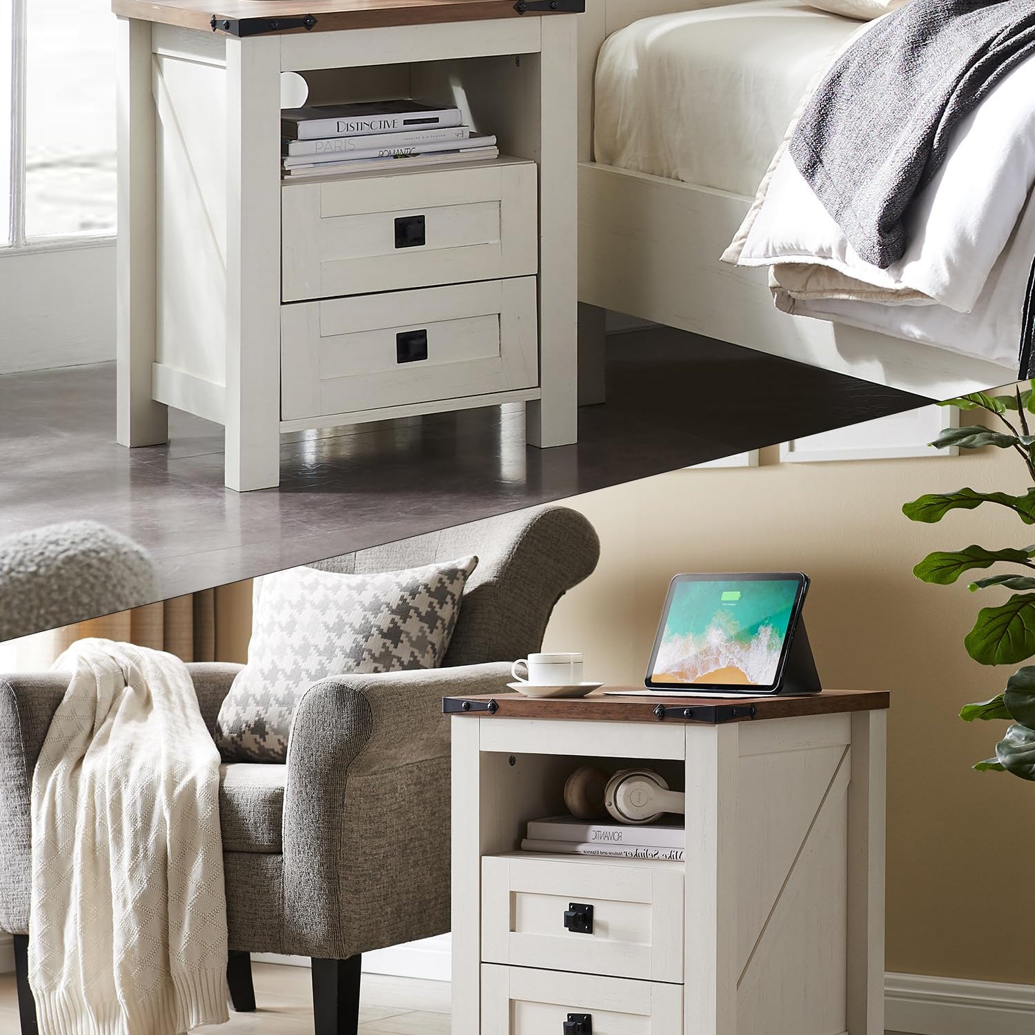 T4TREAM Nightstand with Charging Station, End Table, Side Table with 2 Drawers Storage Cabinet for Bedroom, Living Room, Farmhouse Design, Wood Rustic, Antique White