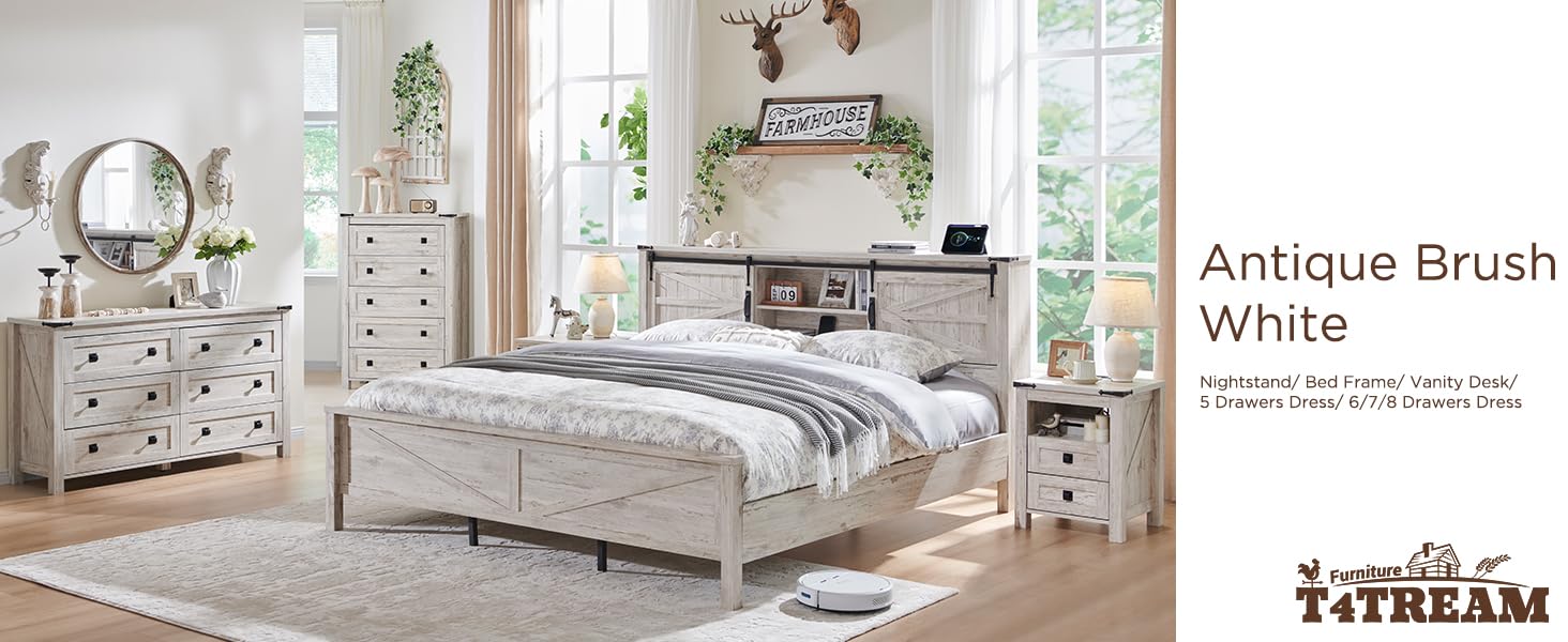 T4TREAM Nightstand wtih Charging Station, End Table, Side Table with 2 Drawers Storage Cabinet for Bedroom, Living Room, Farmhouse Design, Wood Rustic, Antique Brush White
