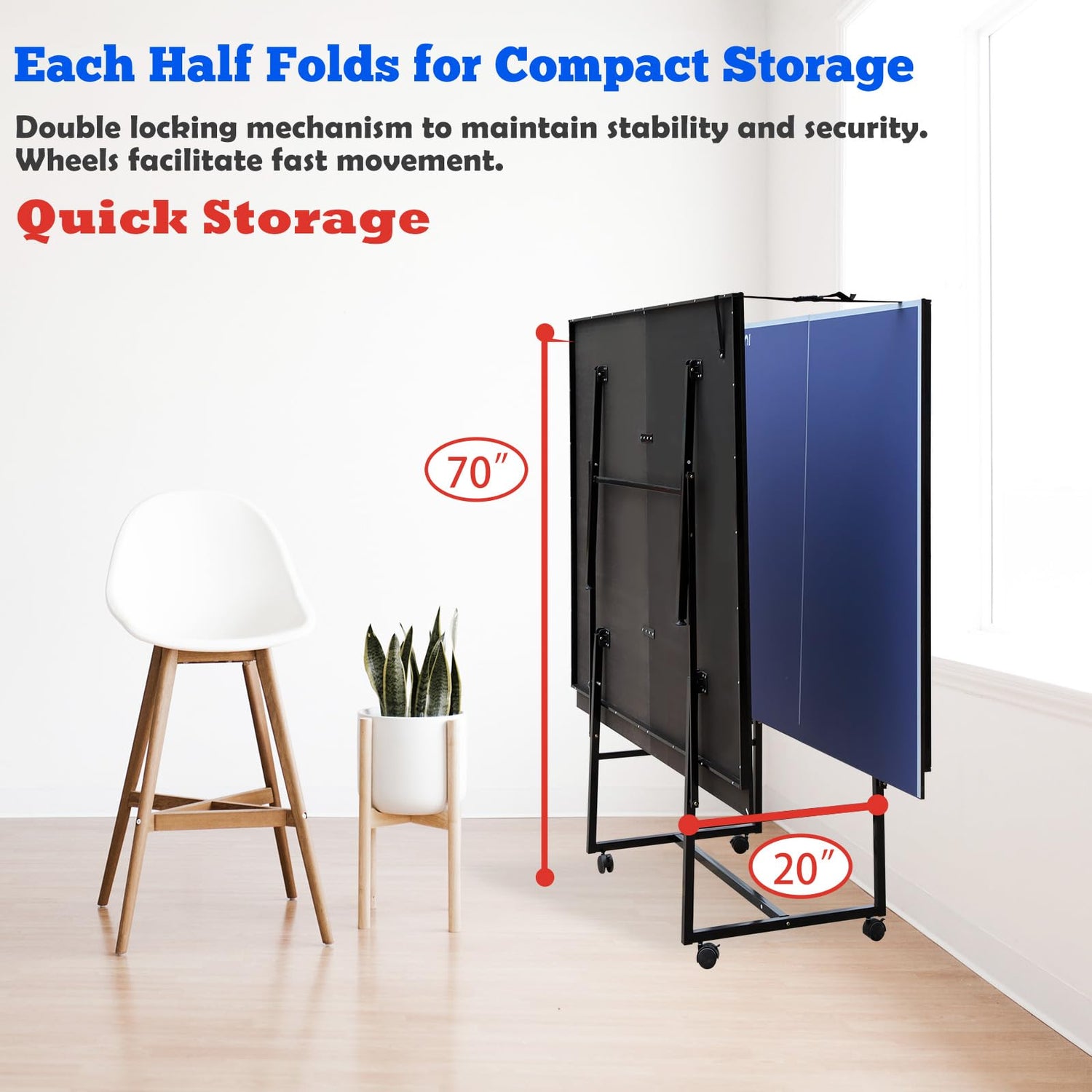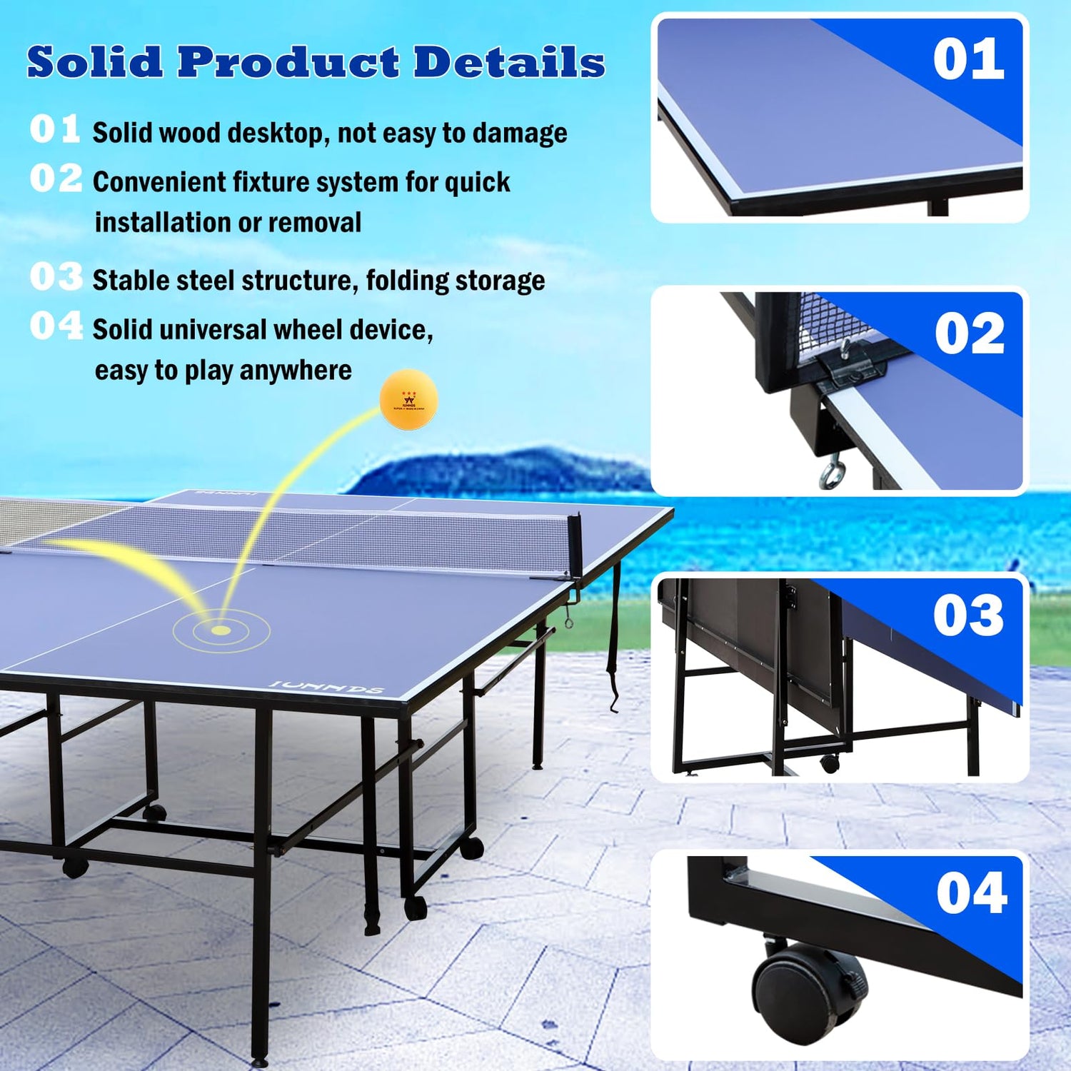 - 【Foldable Table】Our table tennis table can be folded on each half, the double locking mechanism can keep it folded for easy storage. Unfold one table half for solo playback mode when without a partner. Our table tennis table with wheels on the bottom and lockable, it can be easily moved and secured to the storage place or playing field.