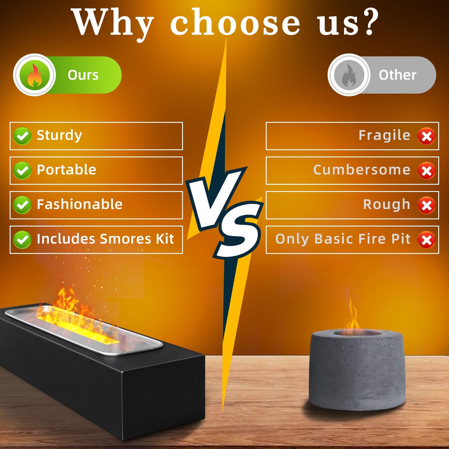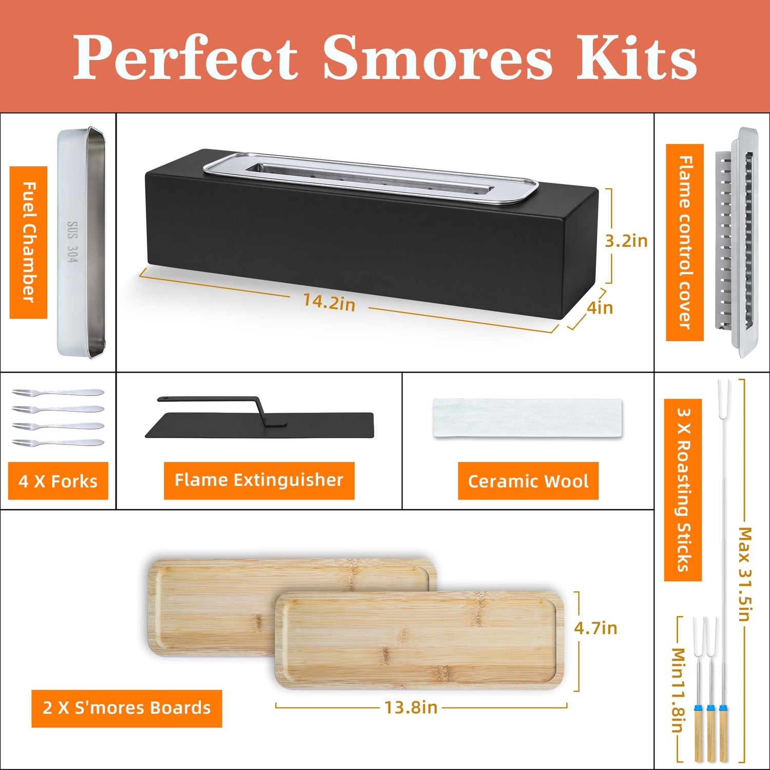- Perfect Smores Kit & Longer Burning Time: The smores maker tabletop indoor kit allows you and your family to enjoy roasting marshmallows, it's an ideal unique gift for s'mores lovers. The fire pits feature an upgraded burner design that holds 450ml of fuel for a burn time of 60-80 minutes, allowing extended enjoyment of the cozy ambiance (Note: flame appearance and burn time are affected by fuel purity, room temperature and weather)