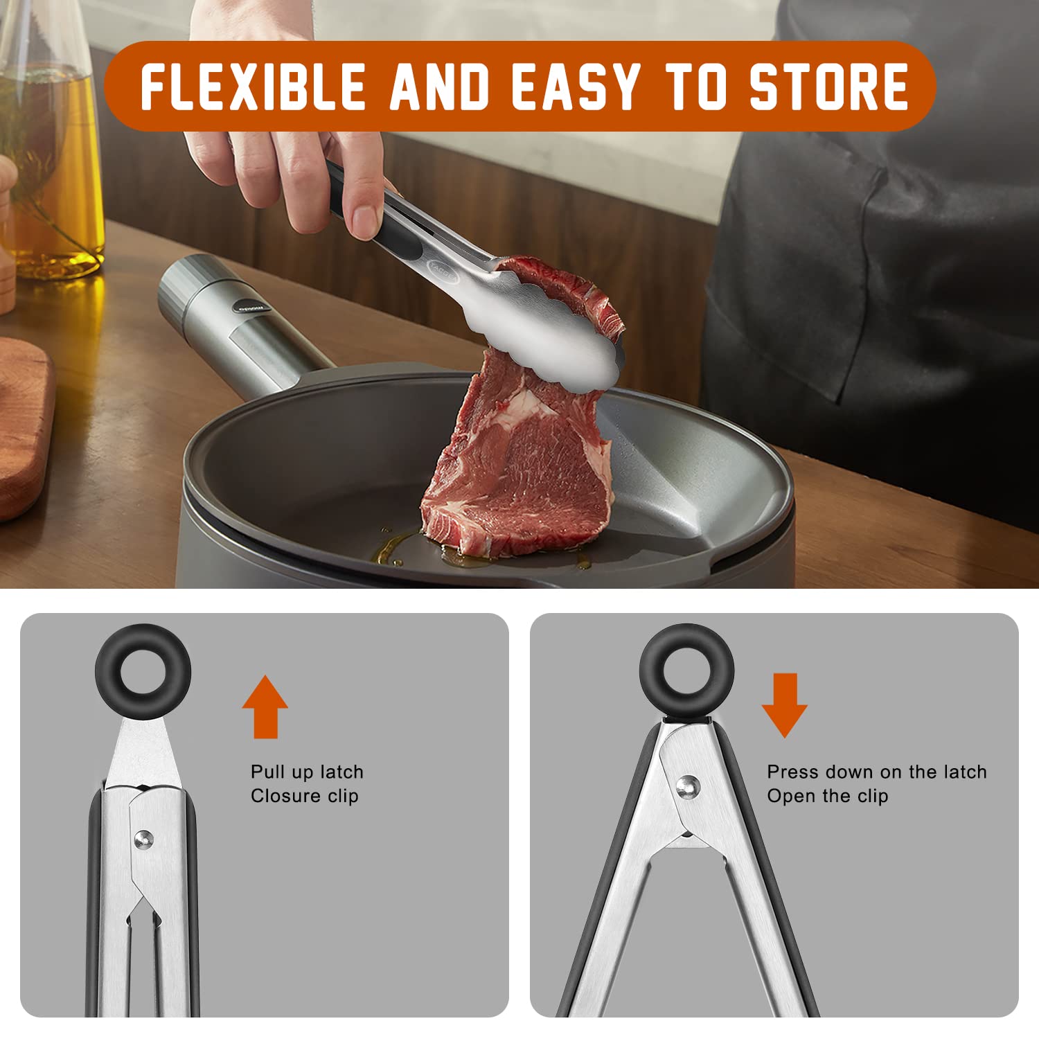 TACGEA Stainless Steel Kitchen Tongs, Silicone Non-slip Grip, Locking Grilling Food Tongs Set of 2, 9-inch & 12-inch