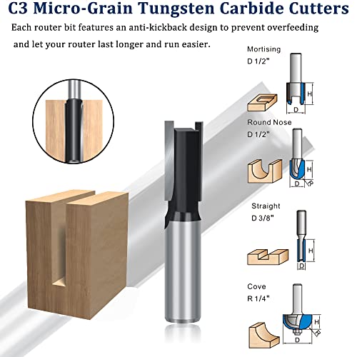 - Size The 1/2 shanks 45 Degree Glue Joint Lock Miter 3 Bits. Premium C3 micro-grain tungsten carbide blades for a sharper longer lasting using. Router bit cutter material is YG6 Solid Hardened Steel.: Wide Working The router bits works great with all kinds of materials and surfaces like woods mdf particle boards plywood panels softwood hardwood and many others. which is truly versatile for your extra convenience. perfect for woodworking.: Multiple Uses These router bit tools can enhance your hardwood working performances and create beautifully handmade furniture on your own. Great for kitchen and bathroom doors office cabinets flooring tables bedroom shelves outdoor frames walls and more.: Exquisite Design Solid hardened steel bodies with Anti-Kickback Design Use on CNC and other automatic table-mounted portable routers.You can complete your work accurately and satisfy your pursuit of exquisite DIY while you use it easily.