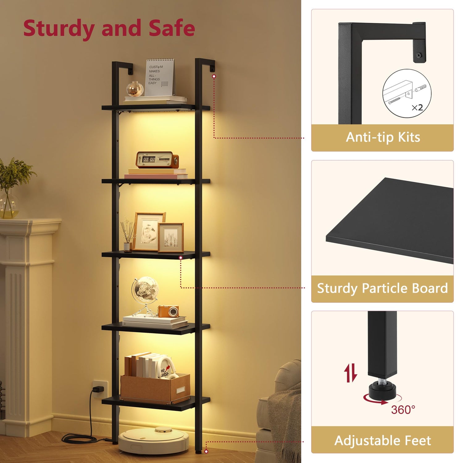 - 【Adaptive Lighting for All Day】This 5 tier ladder shelf with light features a versatile light strip with three adjustable colors, offering both functionality and ambiance. Easily control the colors and brightness to provide ideal lighting for reading, working, or relaxing.