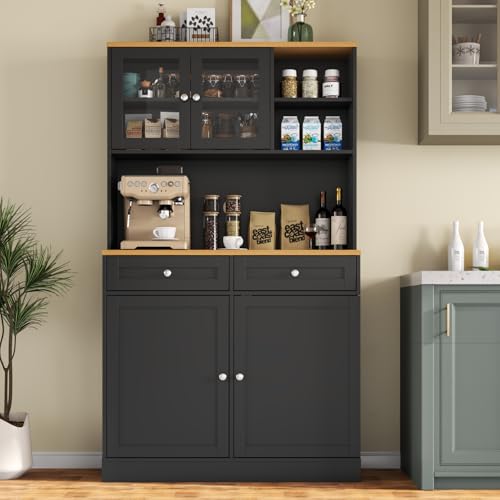 Tall Pantry Cabinet, Modern Kitchen Hutch with Microwave Stand, Kitchen Pantry Storage Cabinet with 2 Darwers & Door Shelf, Food Pantry with Glass Doors & Adjustable Shelves for Dining Room, Black