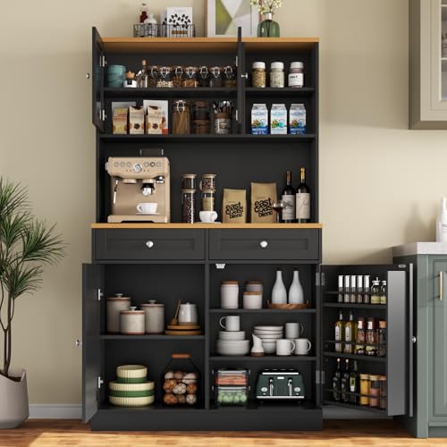- [Pantry Cabinet with Large Space]-This kitchen pantry cabinet offers 9 compartments and 5 adjustable shelves, perfect for storing items of various sizes, keeping essentials organised. The spacious countertop and 2 smooth-gliding drawers can accommodate often-used items for easy access. It also includes a 3-layer door-side storage rack, perfect for spices, seasonings, and small items, streamlining kitchen organisation. A hole in the back helps you manage the wires.