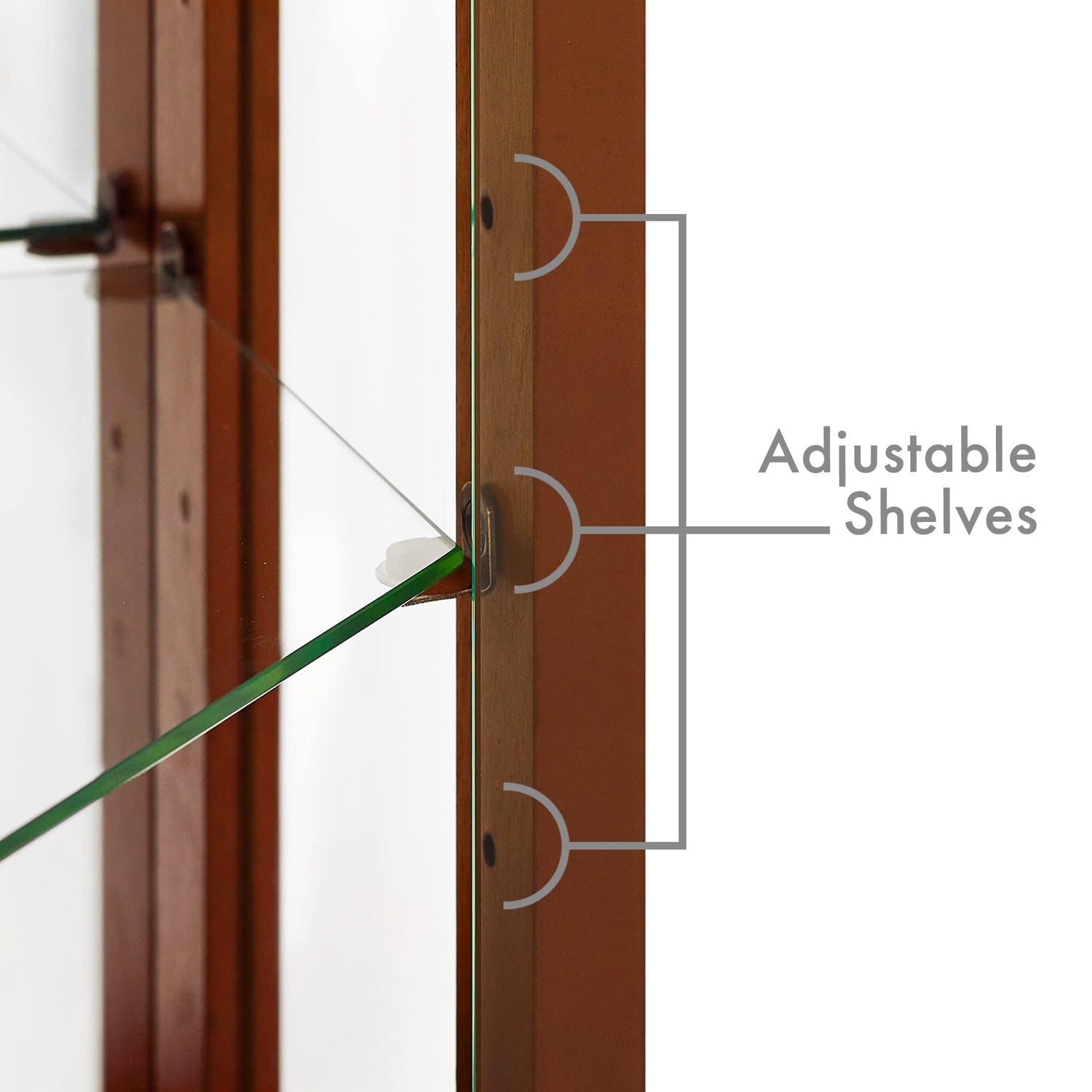 - TEMPERED GLASS SHELVES: This curio cabinet with glass doors has a total of 6 shelves which provide plenty of flexible storage space. 2 are fixed-in-place wood shelves, and the other 4 are tempered glass shelves which can be adjusted, and each shelf holds up to 15 lbs. Simply move the shelf pegs into the desired pre-drilled hole height to adjust the tempered glass shelves.