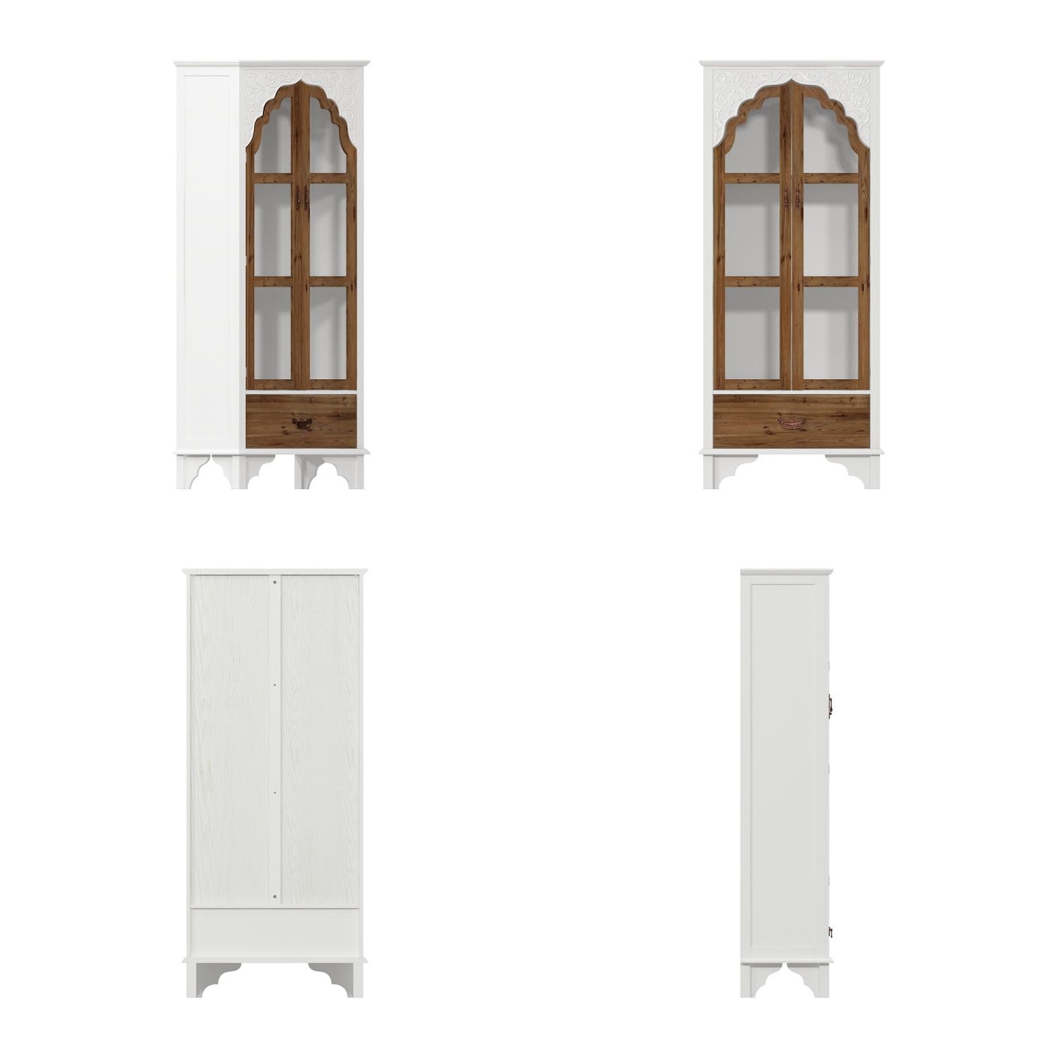 TAMUNE Carved Storage Cabinet with 2 Glass Doors & Drawer, Pooja Mandir with 3-Tier Shelves, Decorative Cabinet Display Cabinet for Living Room White and Walnut (31.5”W x 15.7”D x 70.9”H)