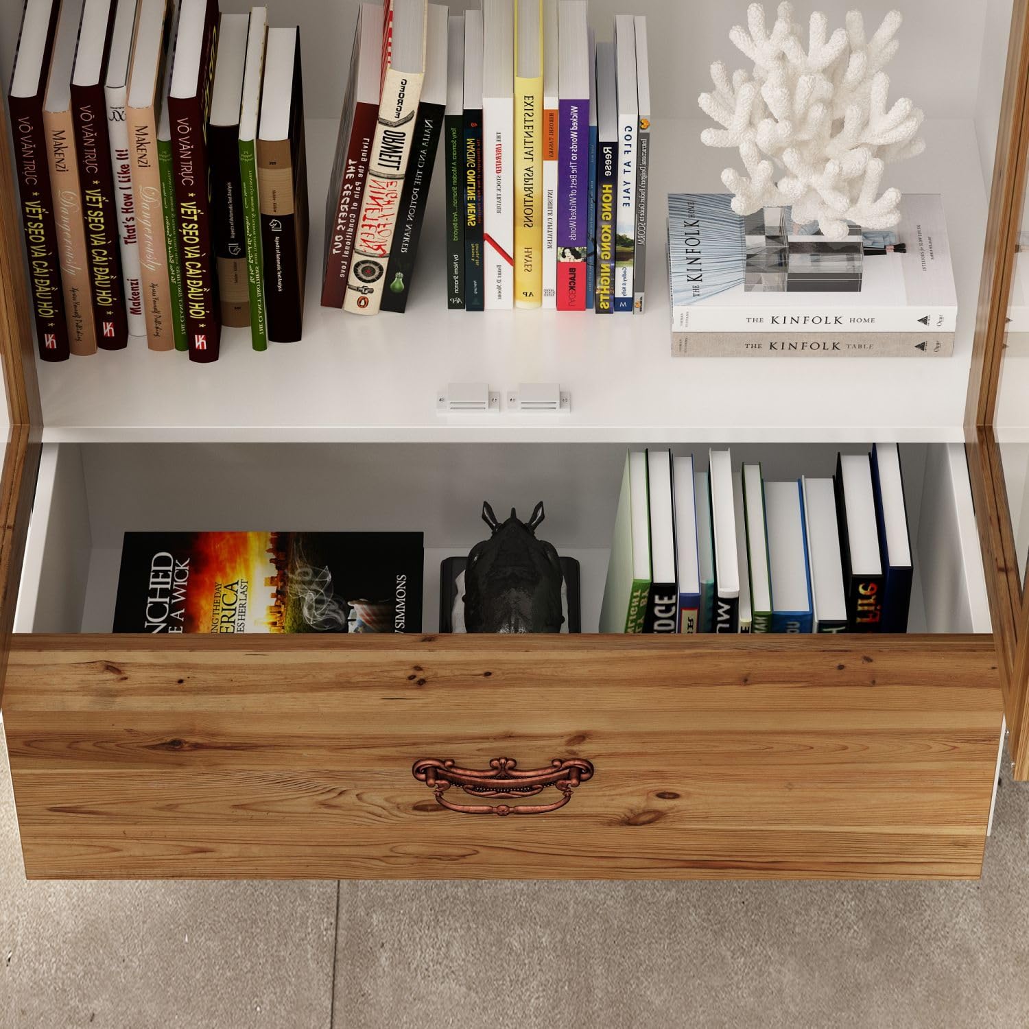 - Quality and Safety - Made of quality MDF and glass, our display cabinet is built to last, the painted surface enhances durability. The drawer with metal rails is smooth to pull. Equipped with anti-tipping devices, it will stand more firmly, ensuring the safety and protecting your family from injury. Overall Dimension: 31.5”(W) x 15.7”(D) x 70.9”(H).