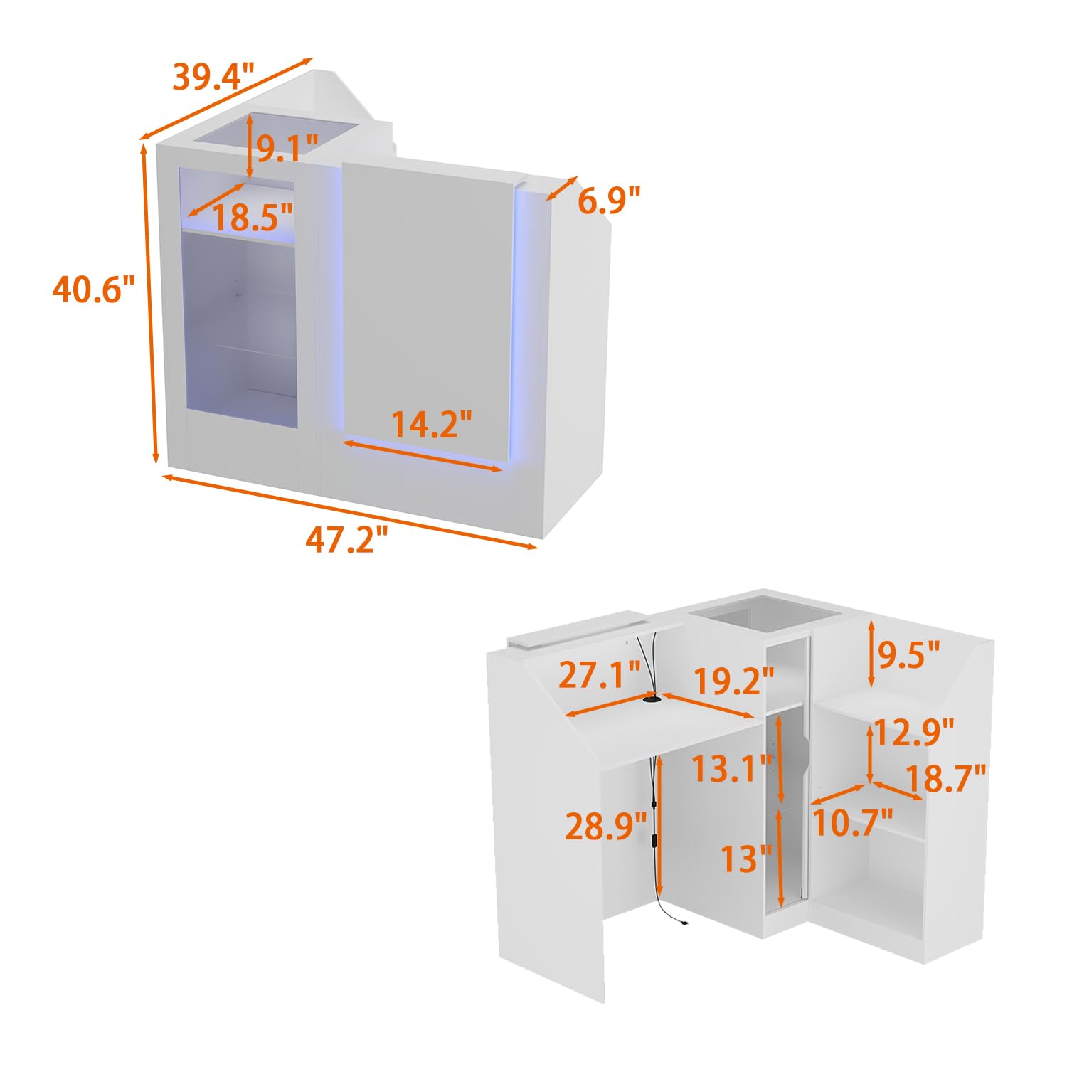 Details: TAMUNE Reception Desk with Lights, Front Counter Table with Glass Shelves, Reception Table, Counter Desk for Retail Checkout, Reception Room Lobby Salon Store, White, 39.4”D x 47.2”W x 40.6”H