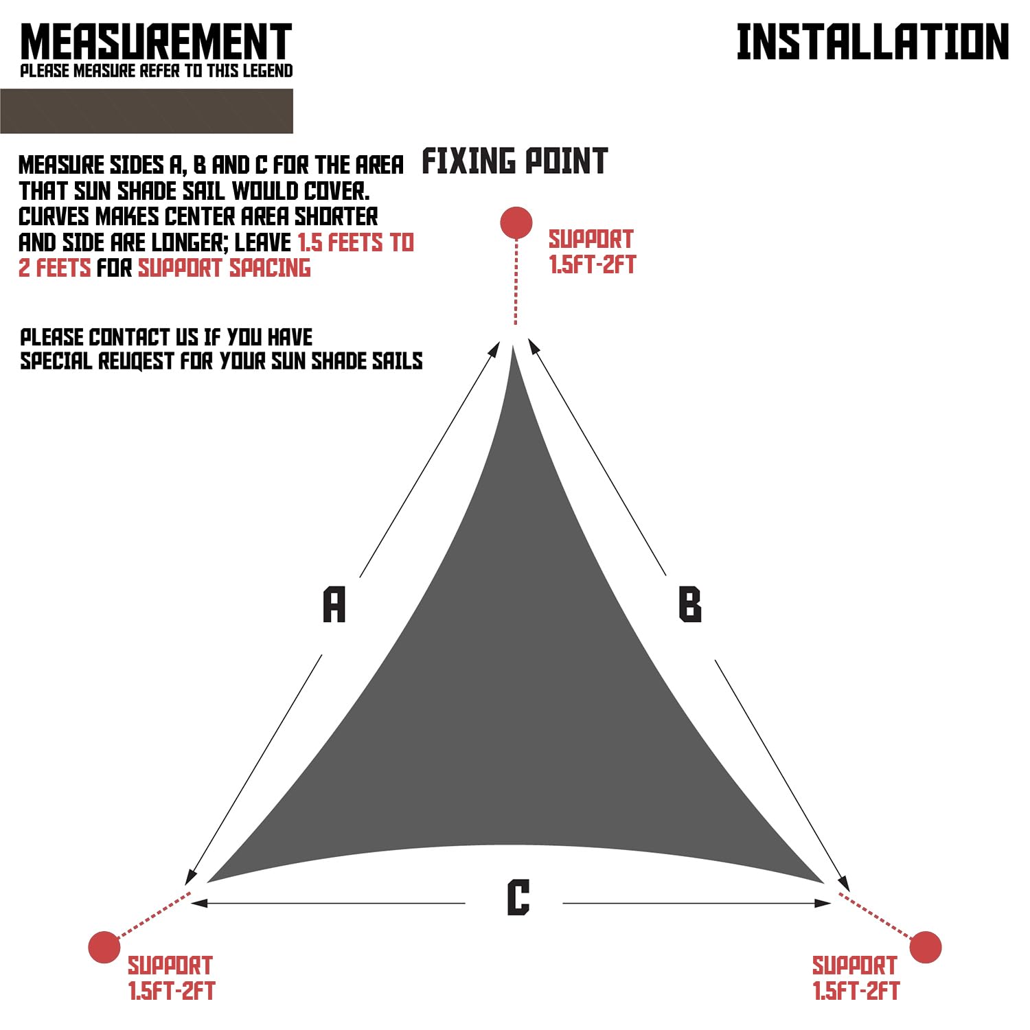 *Our sun shade sails have curves on each side to enhance pull strength and prevent drooping on the sides. Due to the curved sides on sun shade sails, the product may have 1-6 inches deviations on side length. For our hand-made products, deviations of 2 inches more or less is not uncommon. Thus, any deviations between 0 and 8 inches are acceptable for our products.