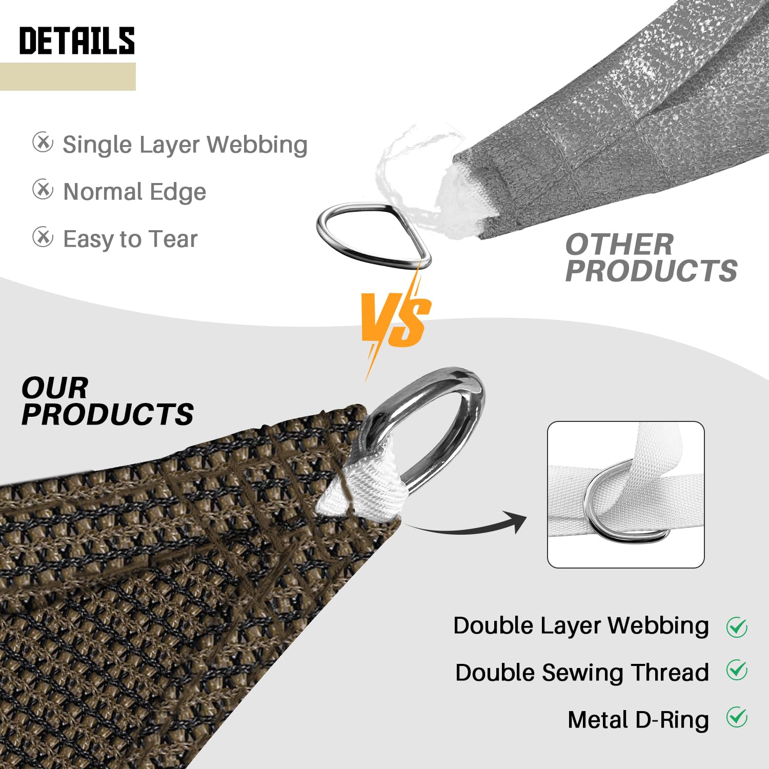 - STRUCTURE DESIGNED FOR DURABILITY: The 20 ft PE rope and durable D-ring make it easy to attach the shade sail to any sturdy place, providing sun protection where it's needed. Heavy-duty, double-wrap design prevents abrasion to help the D-ring attach securely to the shade sail.
