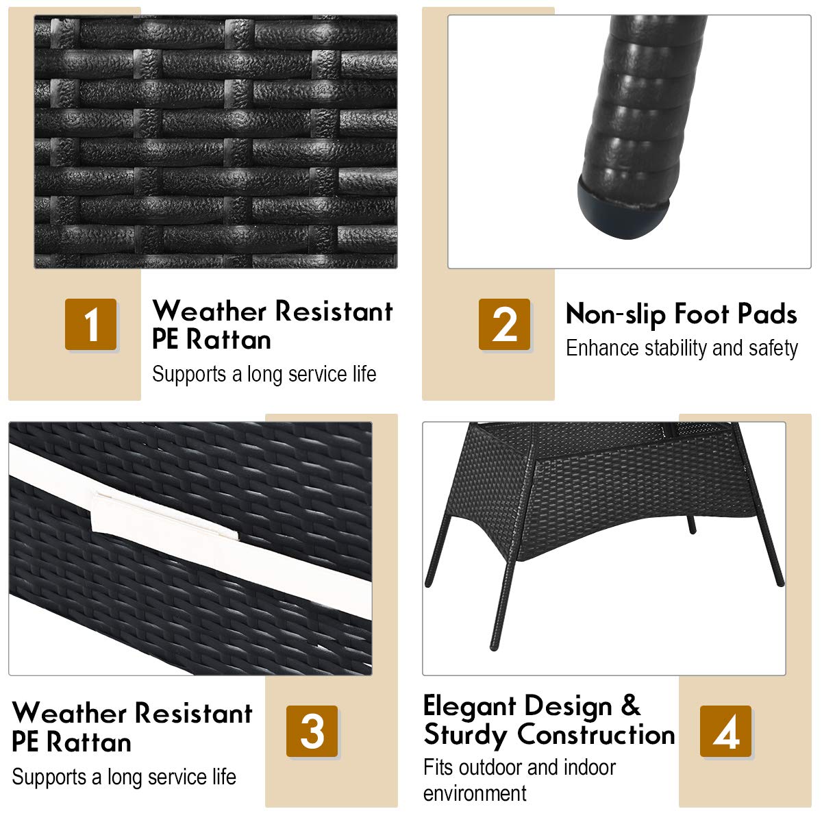 - Weather Resistant Materials: This dining table set has a stable and sturdy steel construction, which can be used for long time. And the premium PE rattan materials can adapt to different weather because it is durable and not easy to crack. What’s more, the cover of cushion is made of washable polyester for better wear resistance.