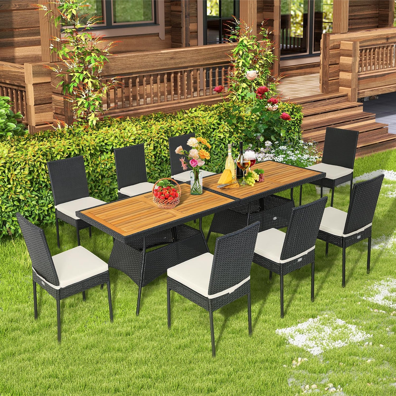 Tangkula 10 Piece Wicker Patio Dining Set, Outdoor Rattan Table & Chairs Set with Padded Cushions, Patio Furniture Dining Acacia Wood Table Set for Balcony Patio Garden Poolside