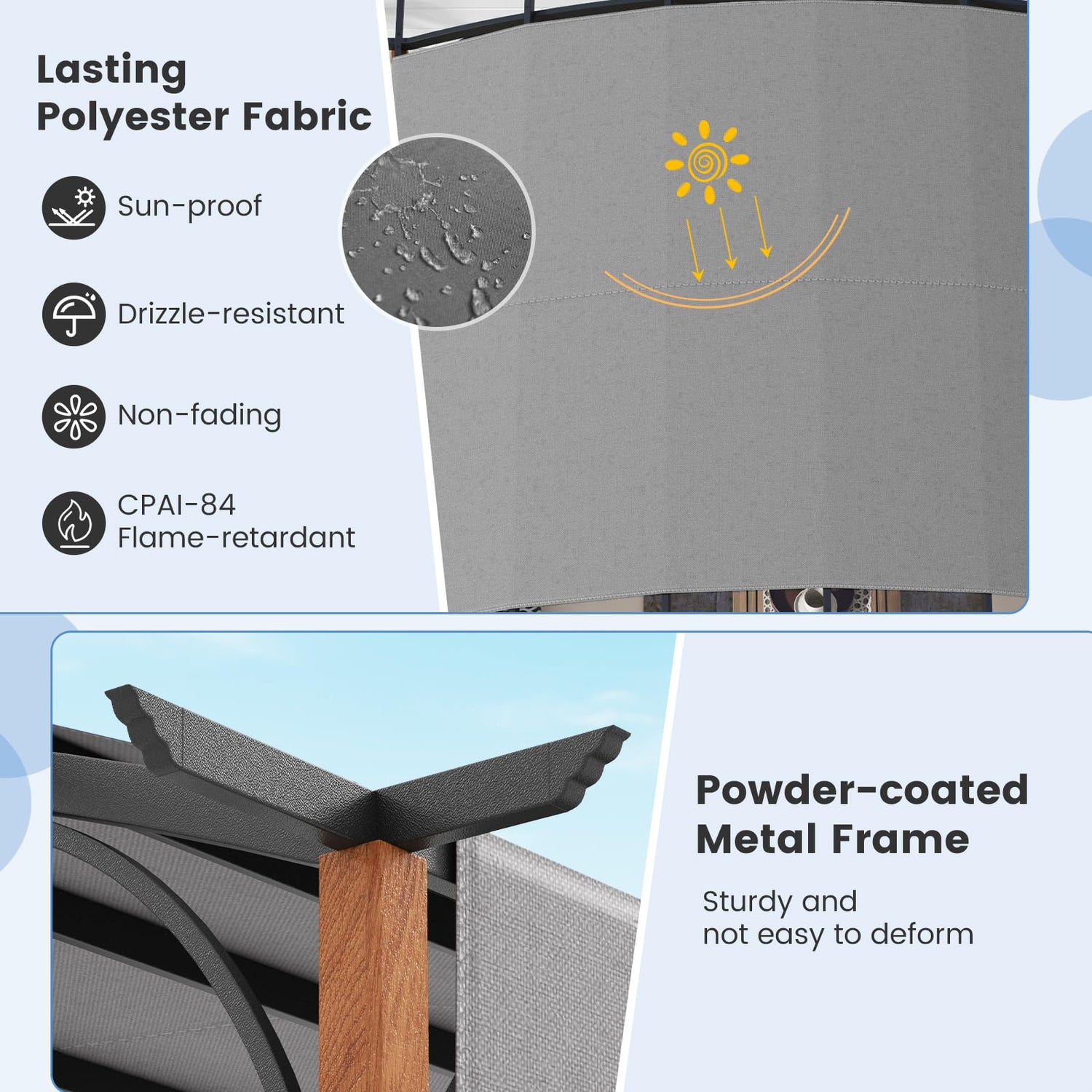 - Lasting & Protective Canopy: The polyester fabric canopy of the metal pergola is wear-resistant, flame-retardant and non-fading, ensuring long-lasting use for years to come. Moreover, the selected fabric is drizzle-resistant and sun-protective, providing a comfortable outdoor retreat for you.