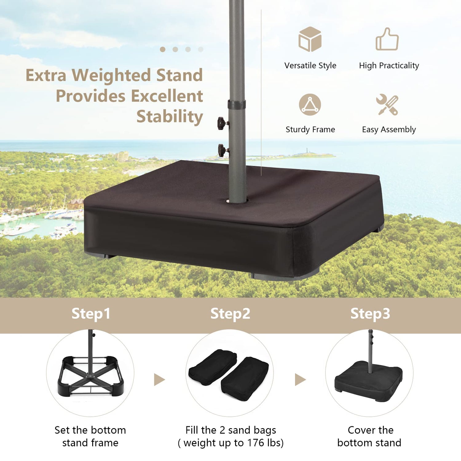 The included umbrella base ensures strong stability