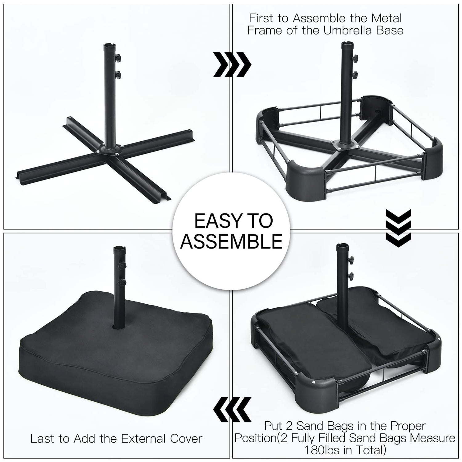 Metal base frame & weighted sand bags for stability adding
