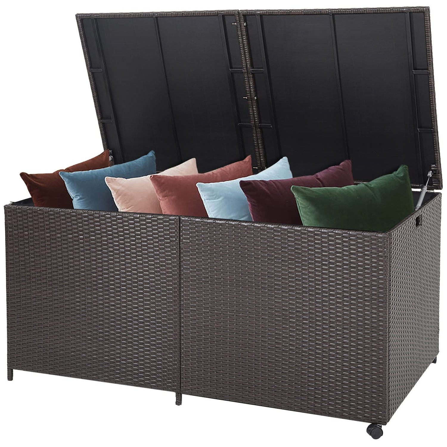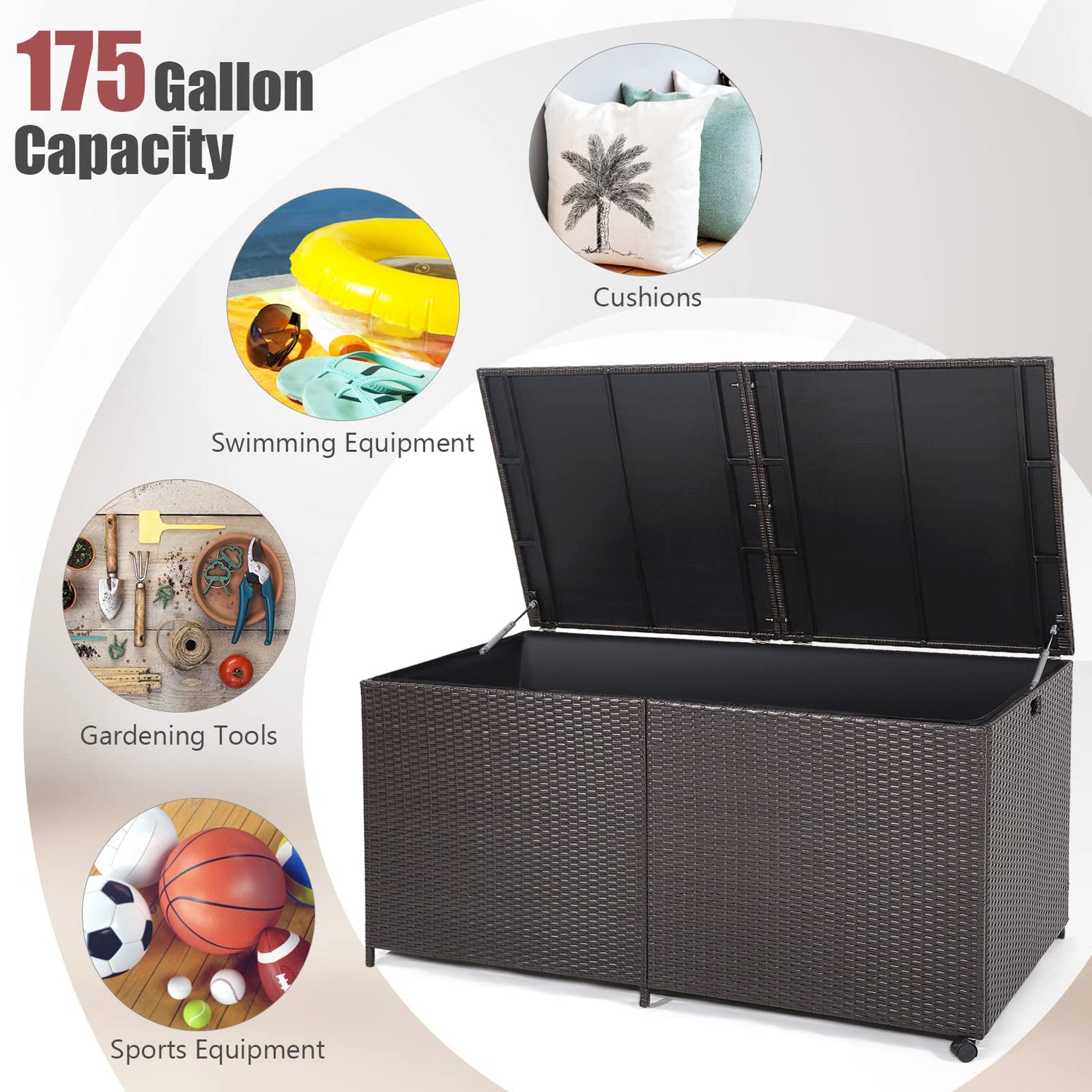 After simple assembly, this outdoor storage box can be moved wherever you want thanks to the cut-out handles and universal wheels. After that, you can open the lid with labor-saving pneumatic rods. Then, the 175 gallon capacity can’t wait to show you how big the inner space is. It can accommodate up to 10 seat cushions (25”L x 27”W x 5”Thickness) and 12 back cushions (25”L x 27”W x 4”Thickness). Zipper up the waterproof liner and cover the lid. The storage has been done. Just leave this deck box outdoors. The colorfast PE wicker will take care of it.