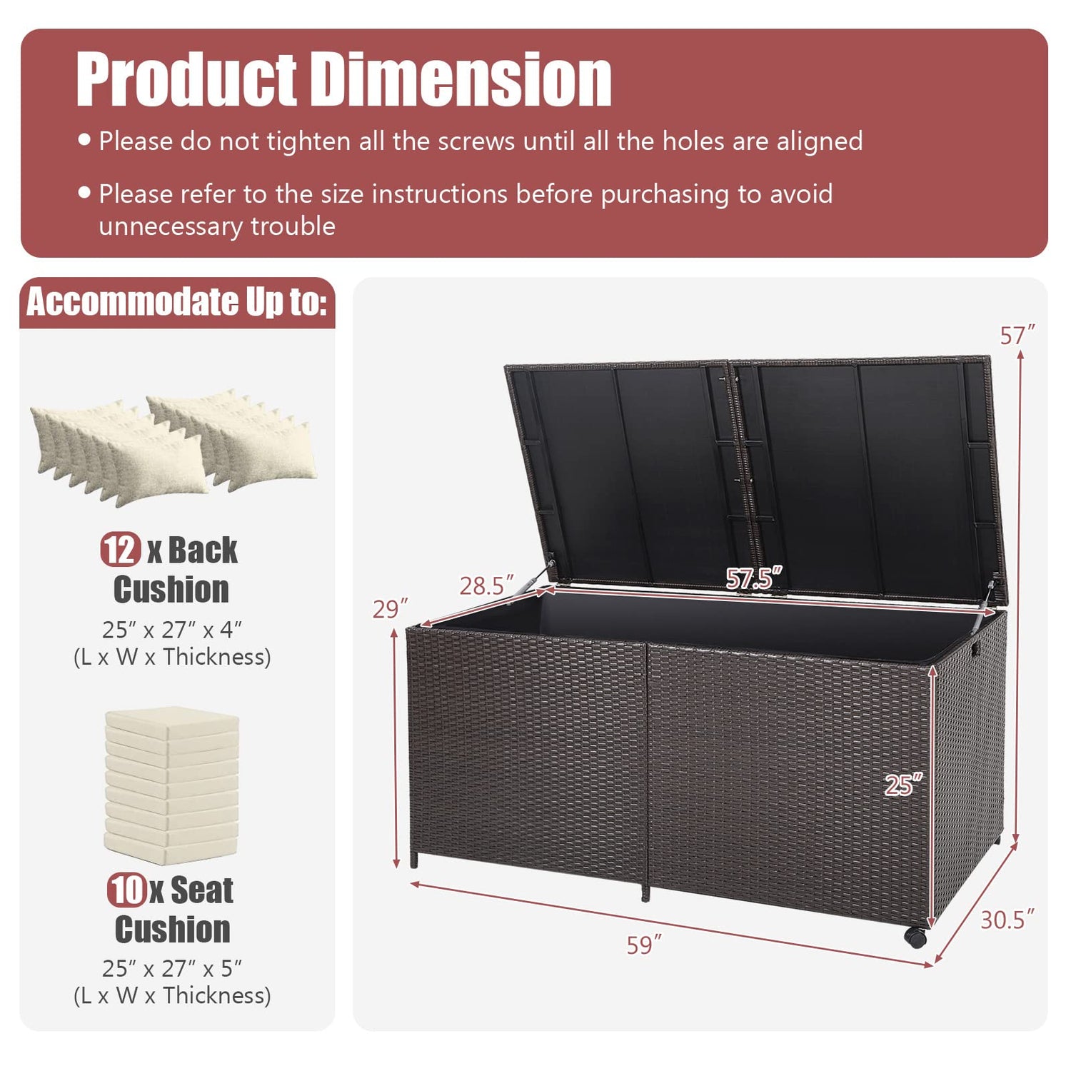 - 175 Gallon Capacity: Measuring 57.5” x 28.5” x 25” (L x W x H) in the inner dimension, this deck box creates 134 gallon capacity that can be stored with 12 back cushions(25” x 27” x 4”) and 10 seat cushions (25” x 27” x 5”).