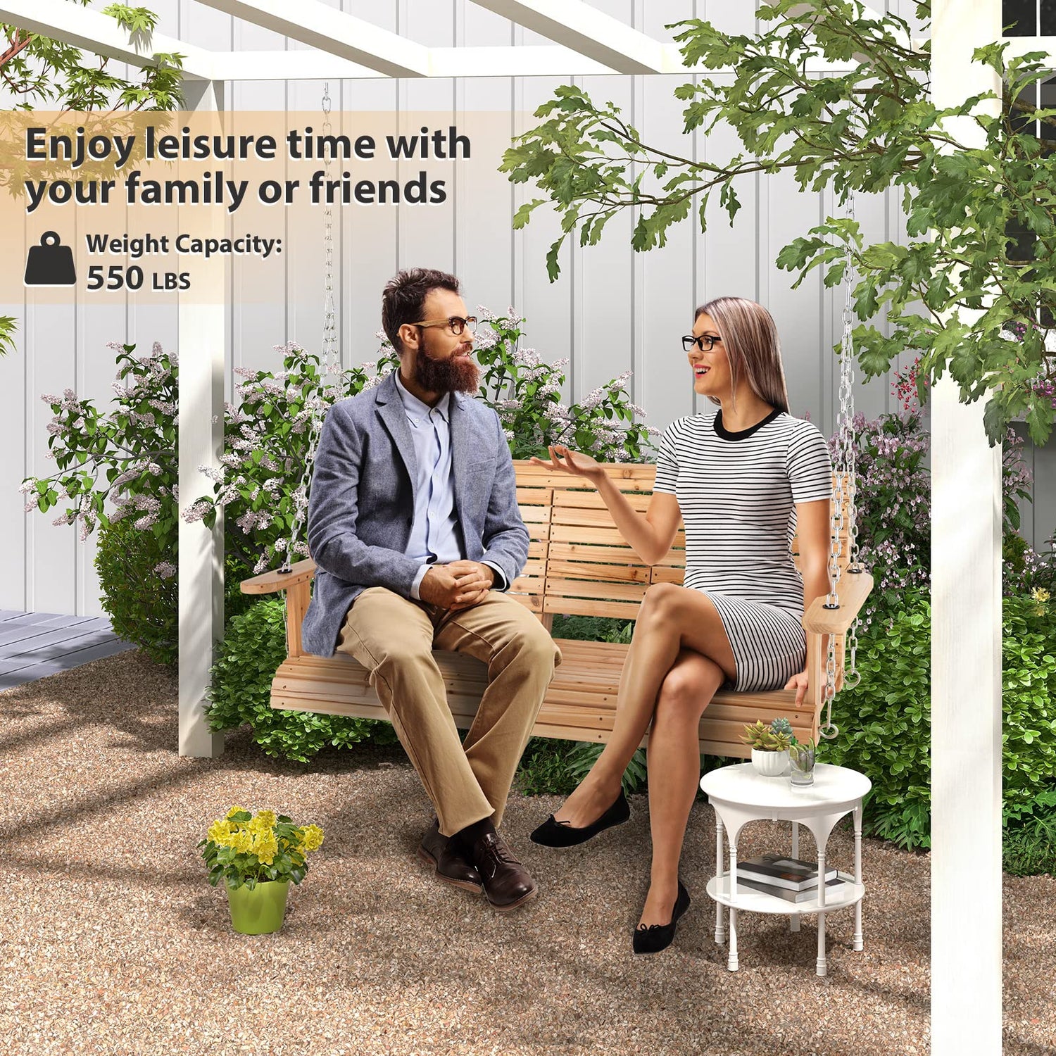 Tangkula 2 Person Hanging Porch Swing, Outdoor Bench Swing with Adjustable Chains, Foldable Cup Holders, High Back, Cozy Armrests, Wooden Hanging Swing Chair for Backyard Deck Garden Natural