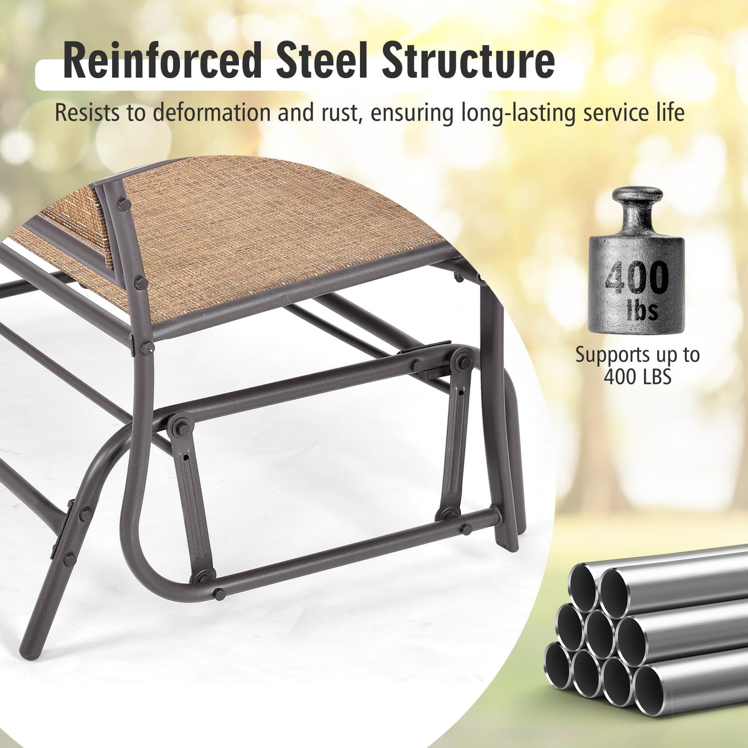 - 【Reinforced Steel Construction】The main frame of the glider bench is constructed of sturdy steel, which is coated with premium finish for rust resistance. And the stable structure enables the loveseat to withstand the heavy weight which is up to 400 lbs. Additionally, the non-slip footpads well protect the ground from scratches.