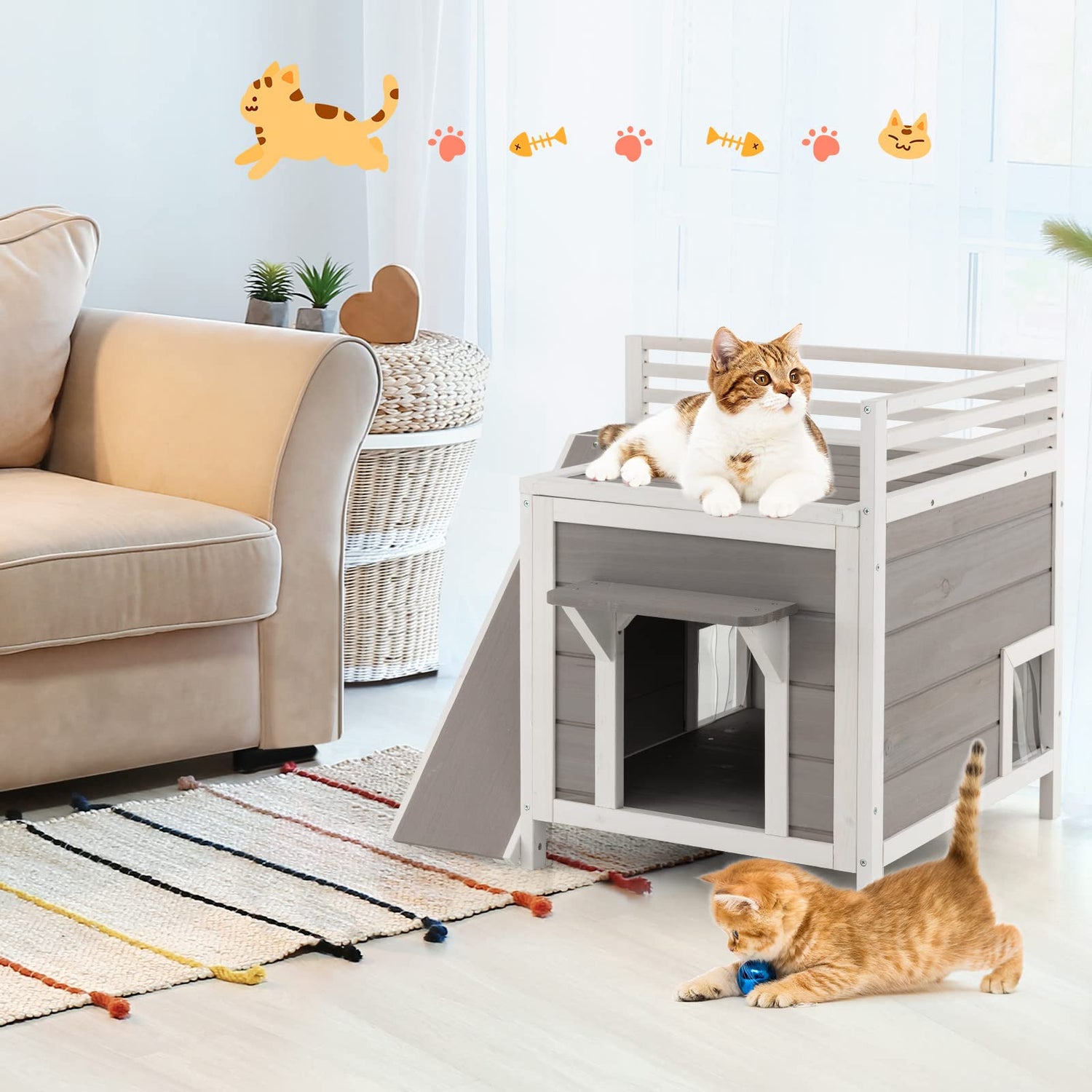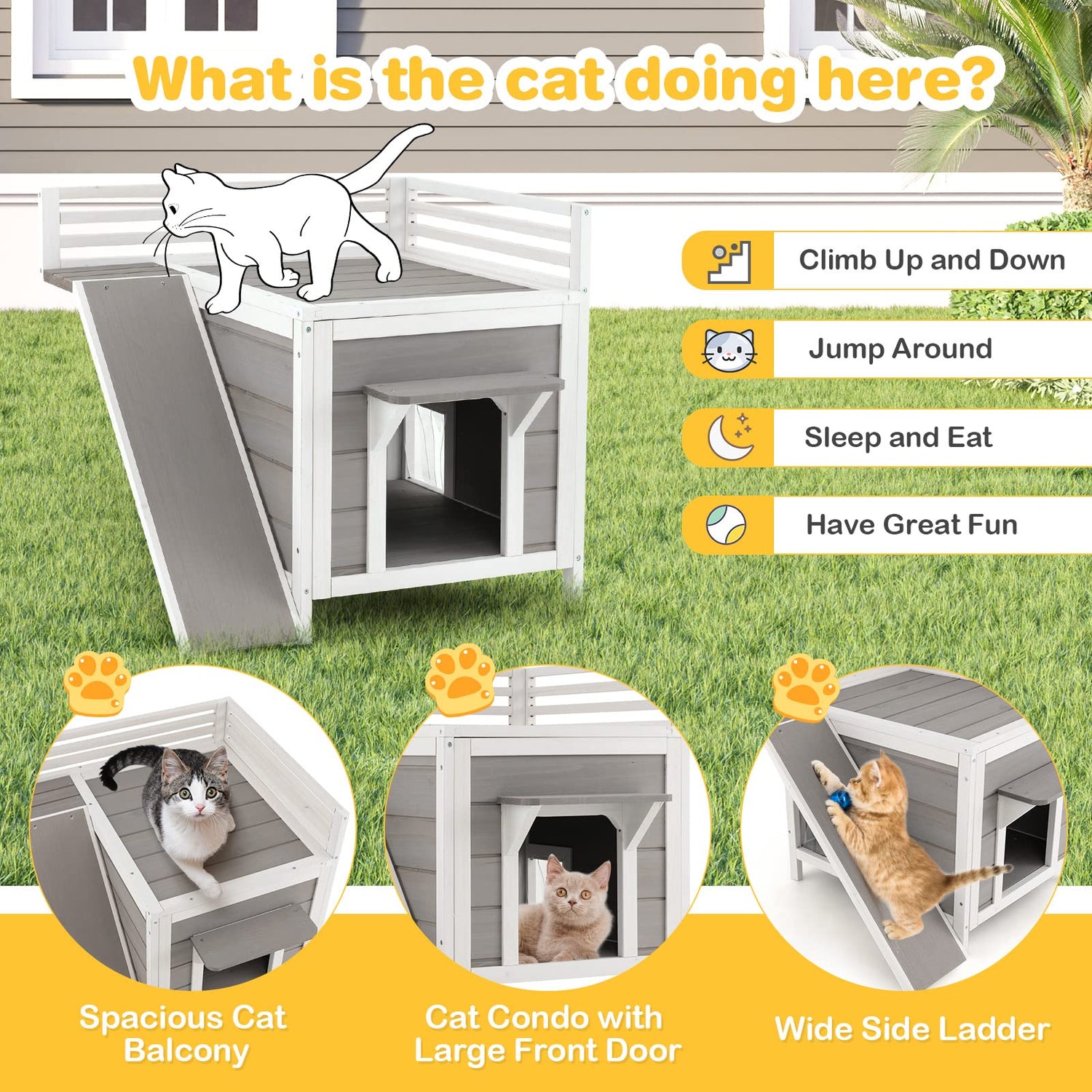 - 【2-Tier Multi-Functional Cat House:】The 2-story outdoor cat house is functional for your cats to Climb Up and Down, Jump Around, Sleep and Eat, or Have a Playing, providing a private space for your lovely kittens. It can act as a cat house for cats to rest and store pet snacks and toys.