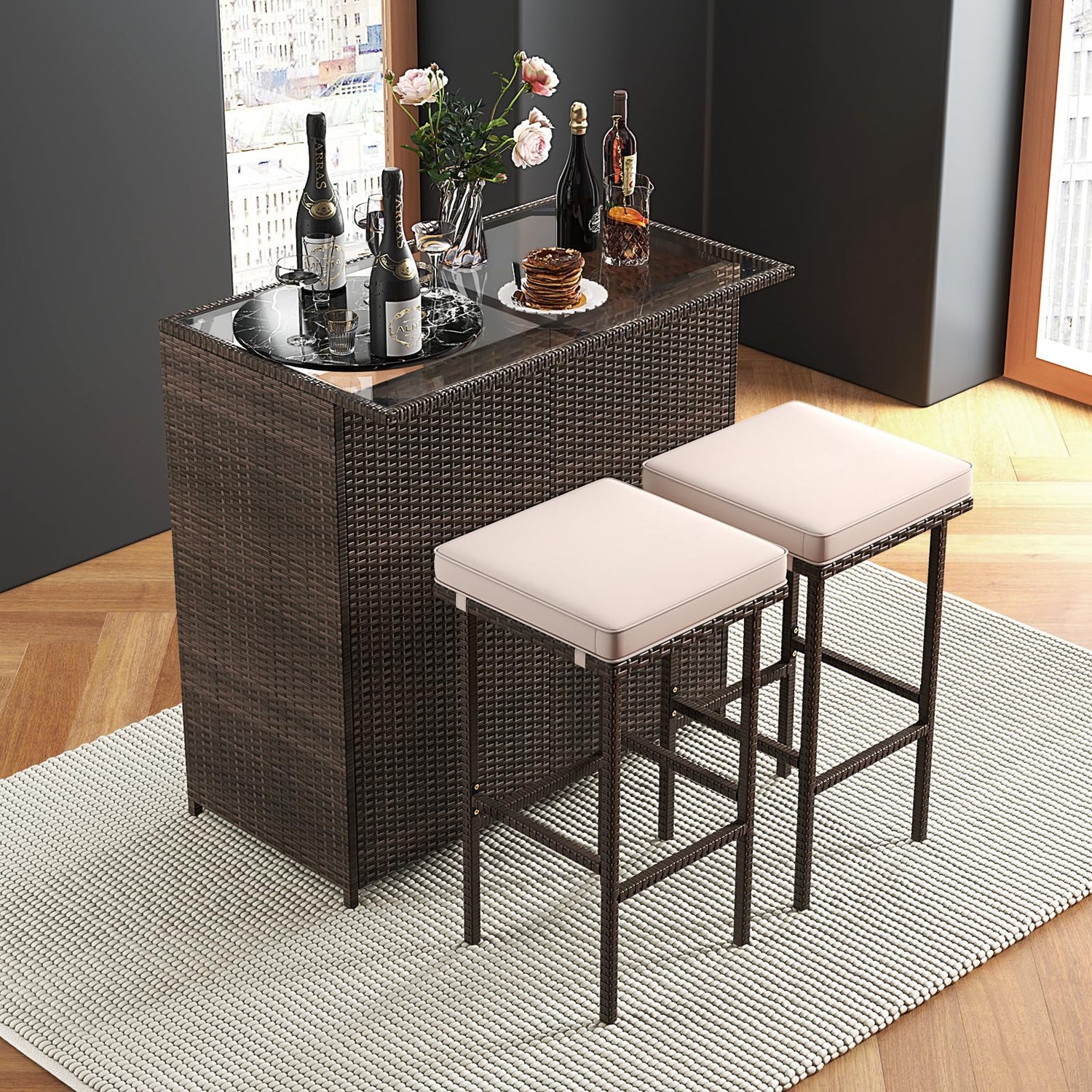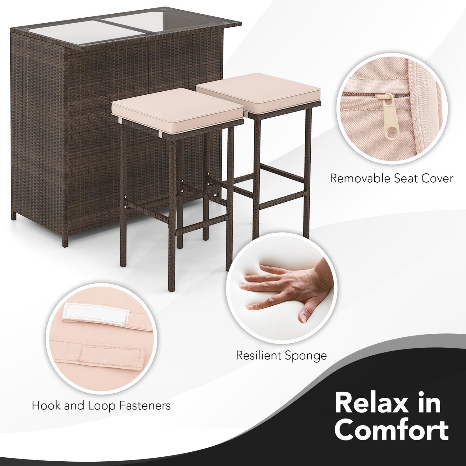Tangkula 3 Piece Patio Bar Set, Outdoor Rattan Bar Table and 2 Stools with Tempered Glass Tabletop, 2-Tier Storage, Removable Cushions, Outside Wicker Conversation Set