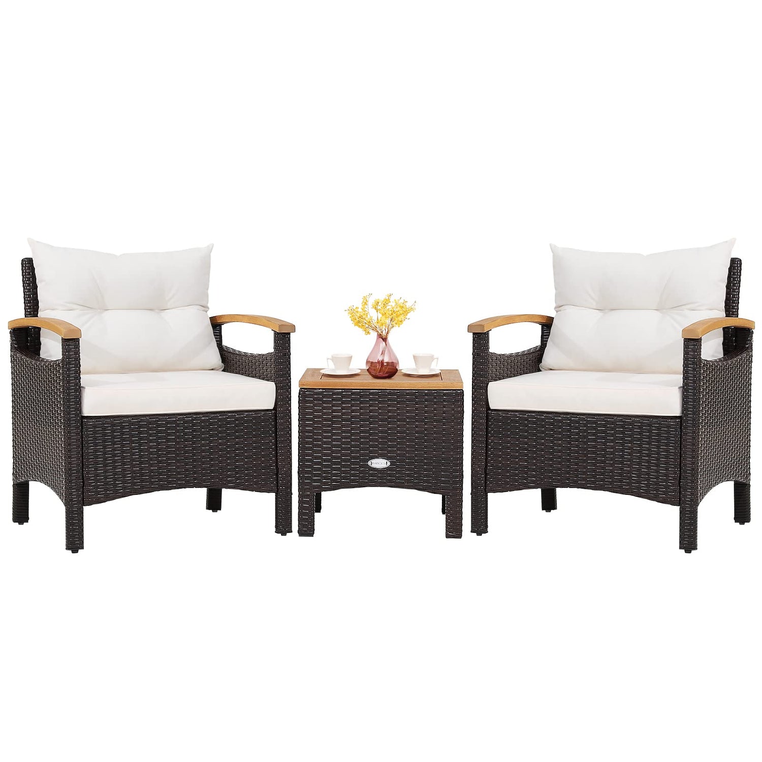Tangkula 3-Piece Patio Furniture Set, Patiojoy Outdoor Rattan Sofa Set with Coffee Table, Patio Conversation Set with Removable Cushion, Cozy Acacia Wood Armrests for Backyard, Poolside (Off White)