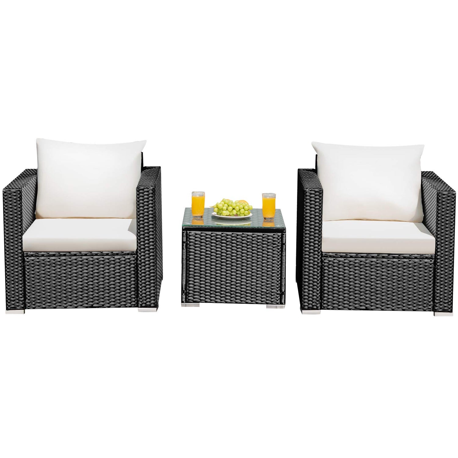 Tangkula 3 Pieces Patio Furniture Set, PE Rattan Wicker Sofa Set w/Washable Cushion and Tempered Glass Tabletop, Outdoor Conversation Furniture for Garden Poolside