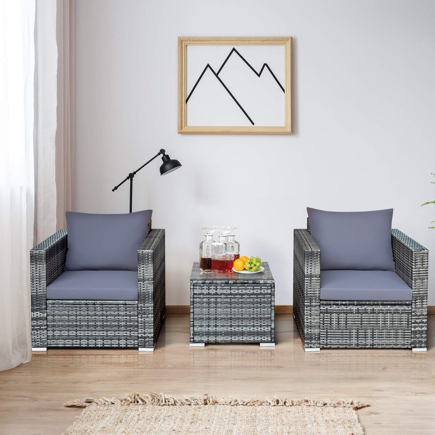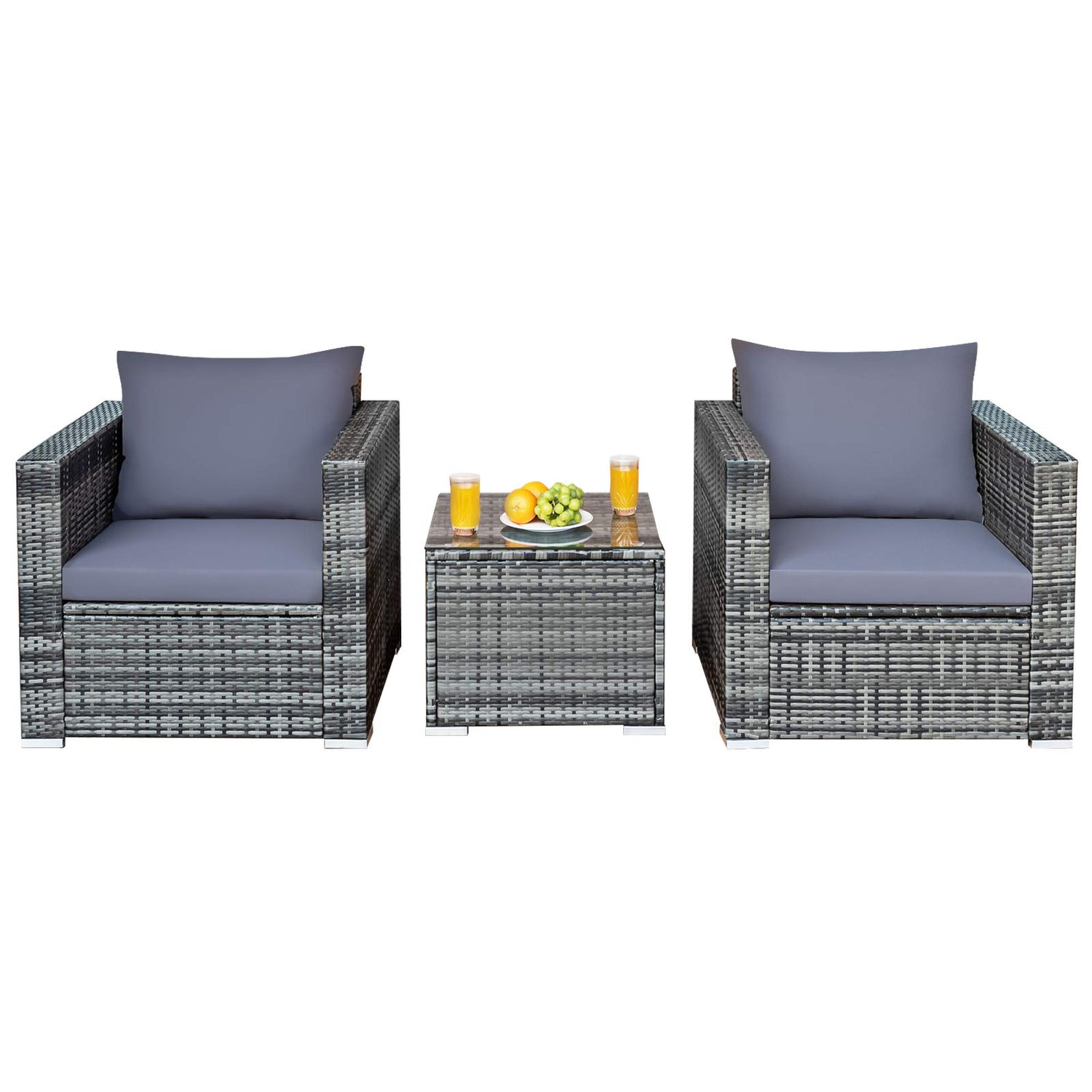 Tangkula 3 Pieces Patio Furniture Set, PE Rattan Wicker Sofa Set w/Washable Cushion and Tempered Glass Tabletop, Outdoor Conversation Furniture for Garden Poolside Balcony