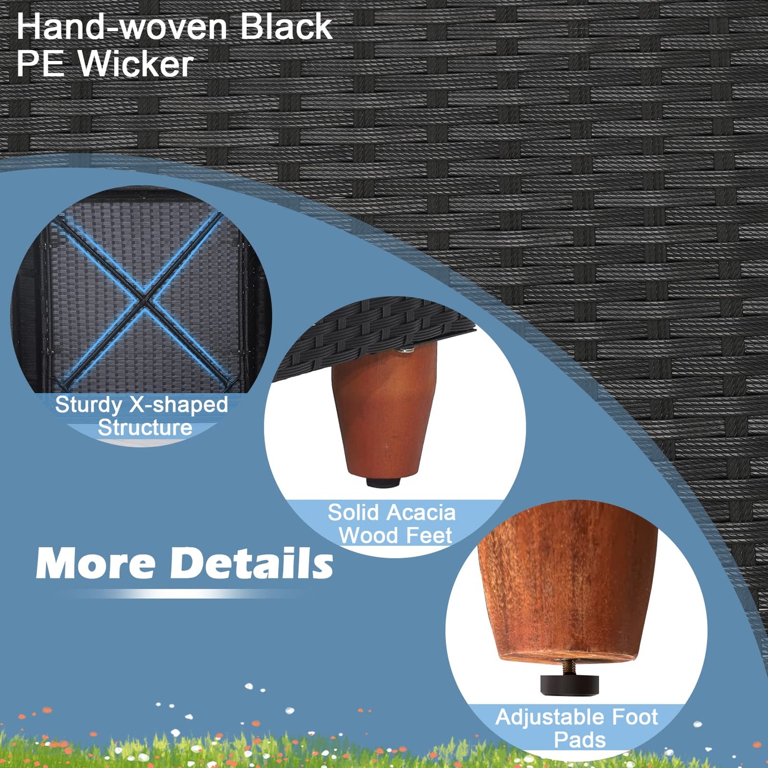 - 【HOW LONG CAN IT STAY WITH US? 】This patio porch furniture will accompany you for a long time thanks to its selected materials. The hand-woven black PE wicker takes the advantage of being colorfast and sun-protective. The sturdy metal frame boasts the ability to be rustproof. And the solid acacia wood makes it stabler to use. Please do not let the product get wet for prolonged service time.