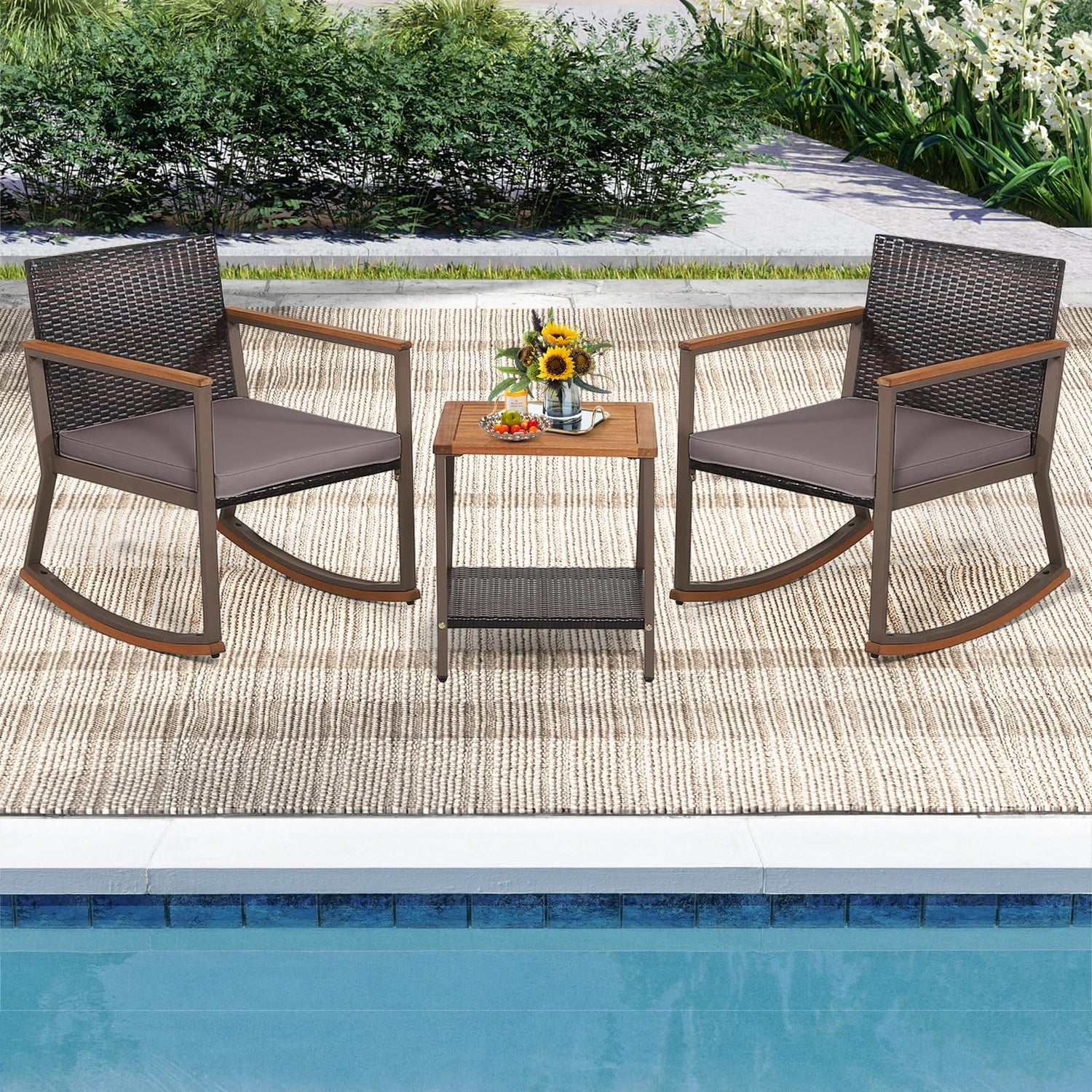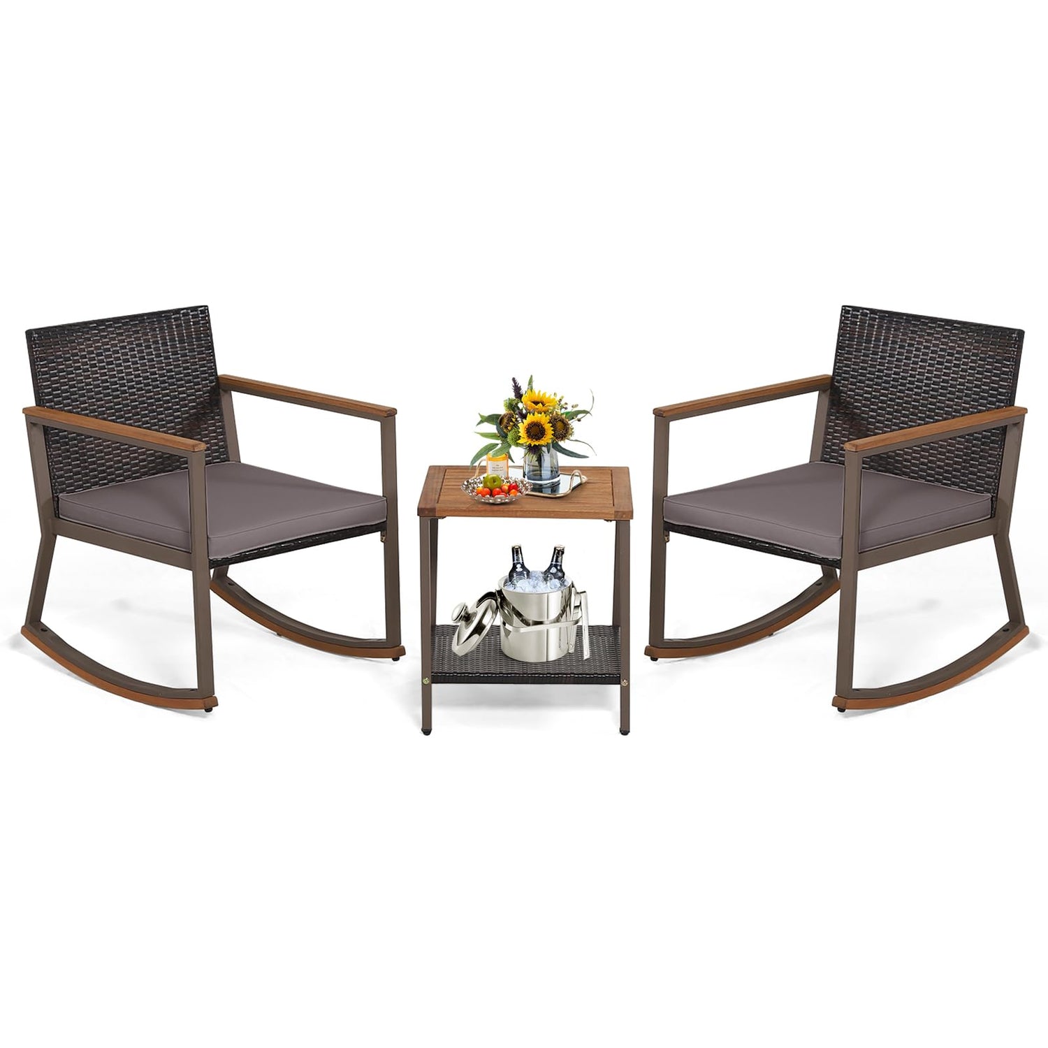 Tangkula 3 Pieces Rocking Bistro Set, Outdoor Rocker Chair with Coffee Table & Cushions, Patio Rattan Furniture Conversation Set for Balcony Porch Poolside (Gray)