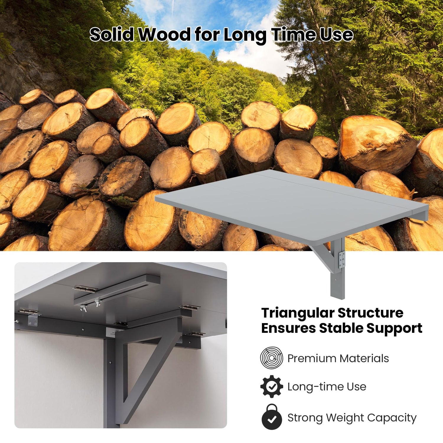 - 【Solid Construction】With a triangular wooden bracket, when mounted on the wall, the table will stand steadily, and the metal hinges and the screw also help fix it. Round edge design avoids accidental injury.